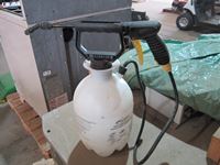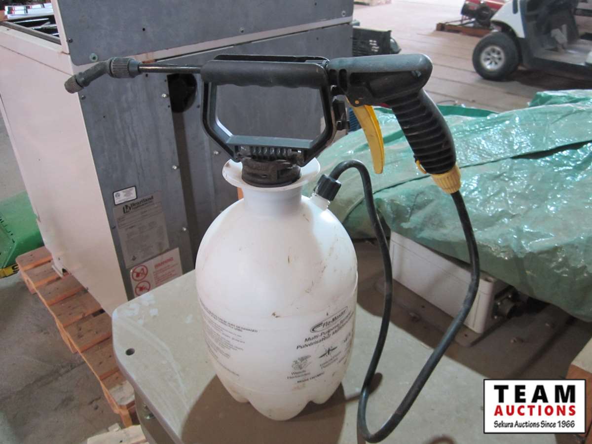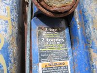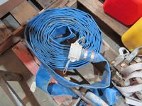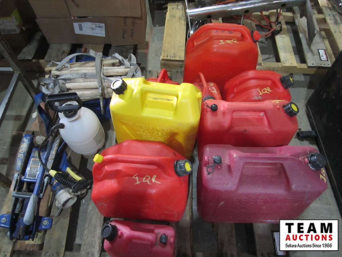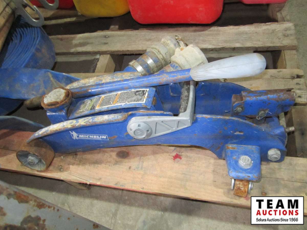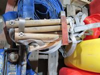 assorted jerry cans, 2" lay flat discharge hose, rope ladder, small sprayer, 2 ton floor jack