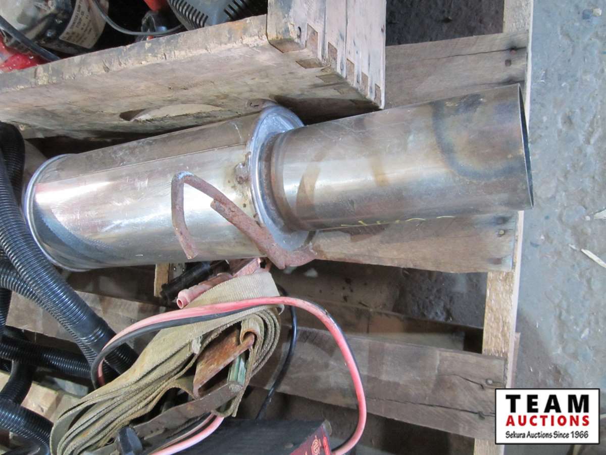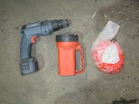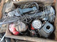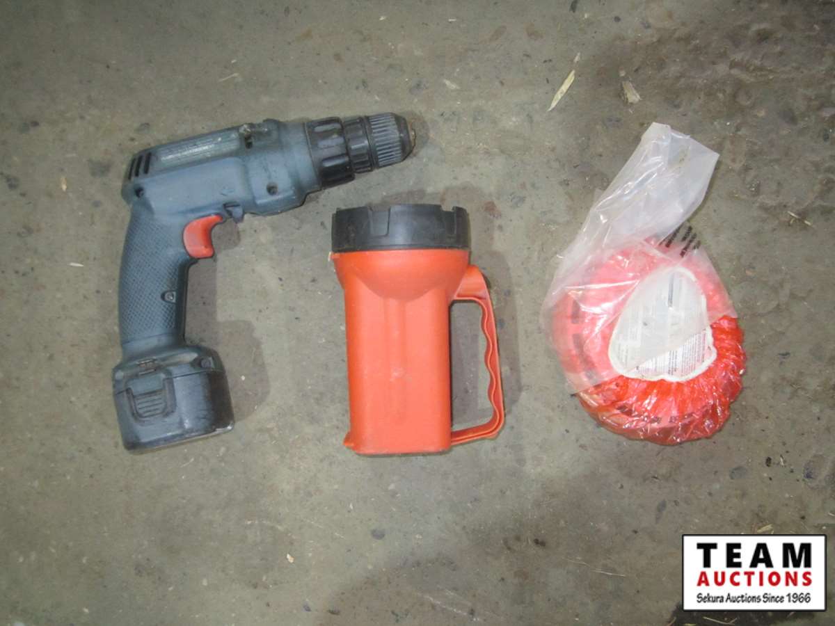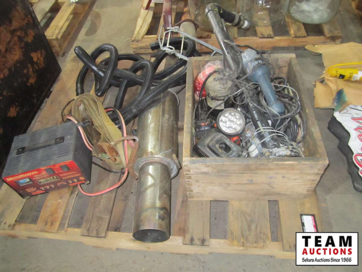 battery charger, muffler, flexible hose, (2) sump pumps, flashlights, cordless drill