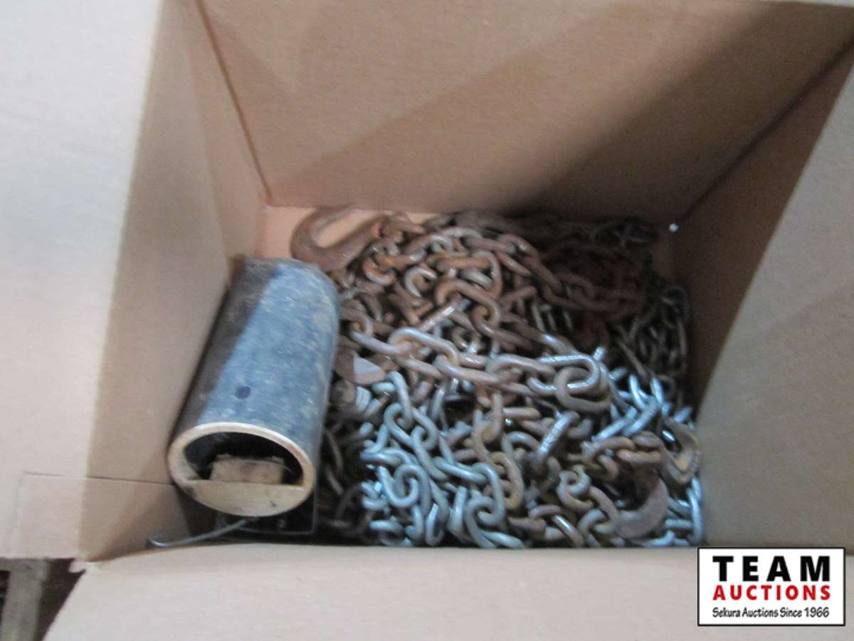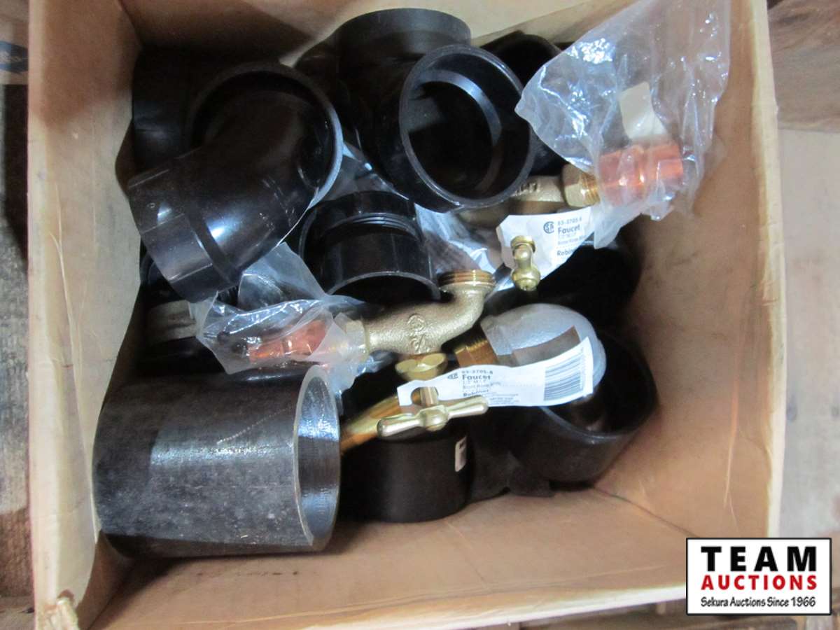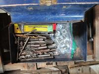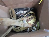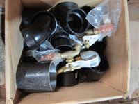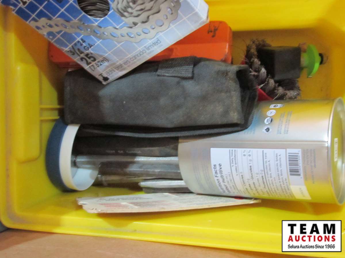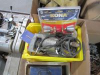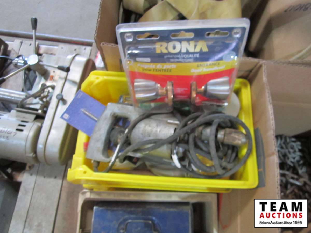 bench vice, rubber tie down straps, ratchet straps, chain, (2) boxes of nails, abs plumbing fittings, brass faucets, entry door set electric drill, test & tune kit, drill bits, Master Craft heat gun, misc hardware