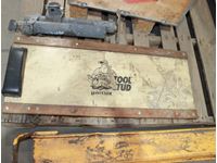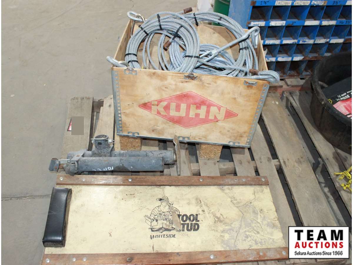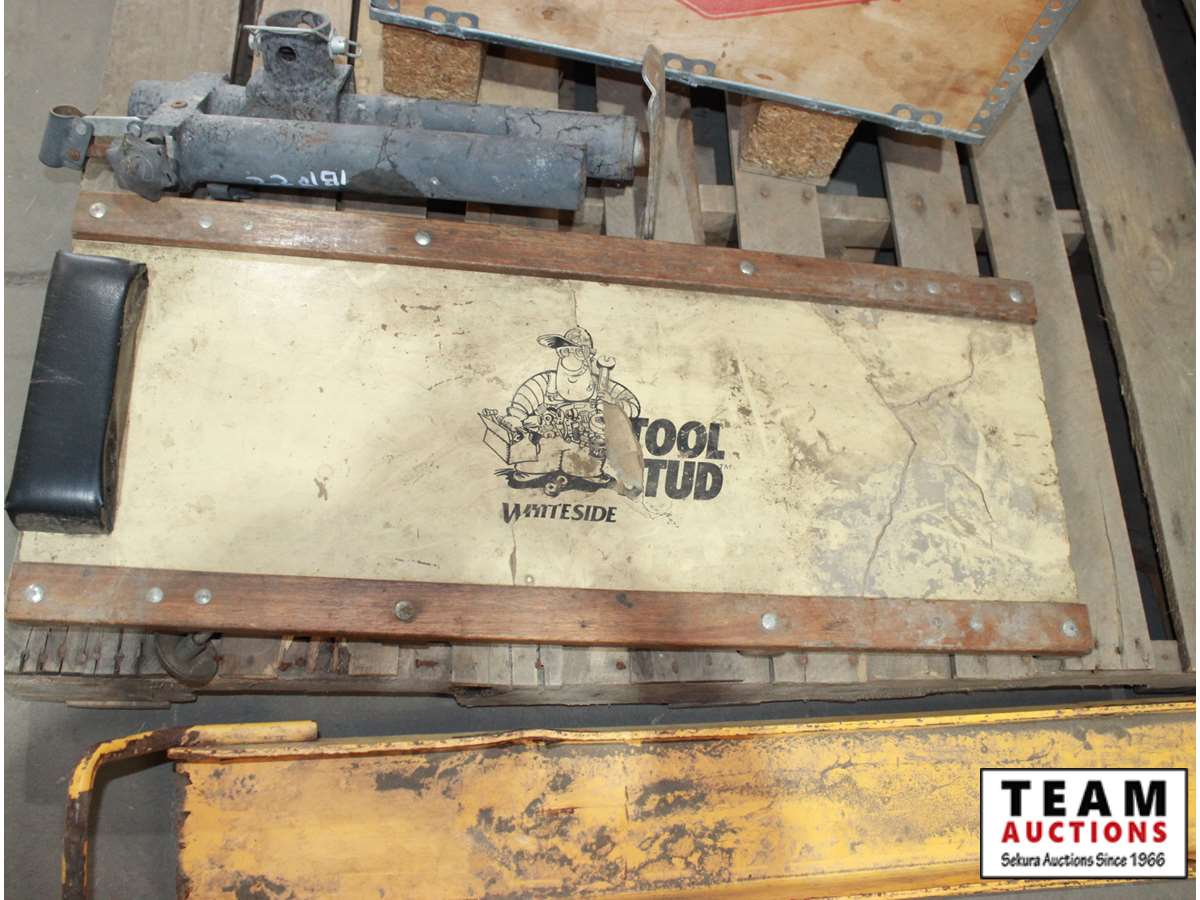mechanics creeper, trailer stand, box of cable lanyard