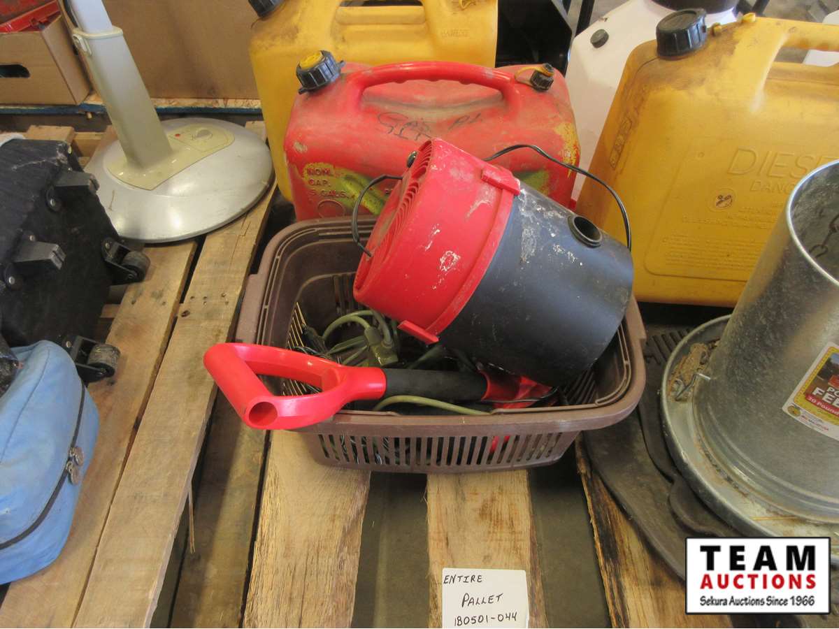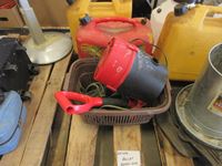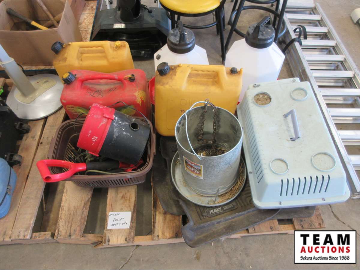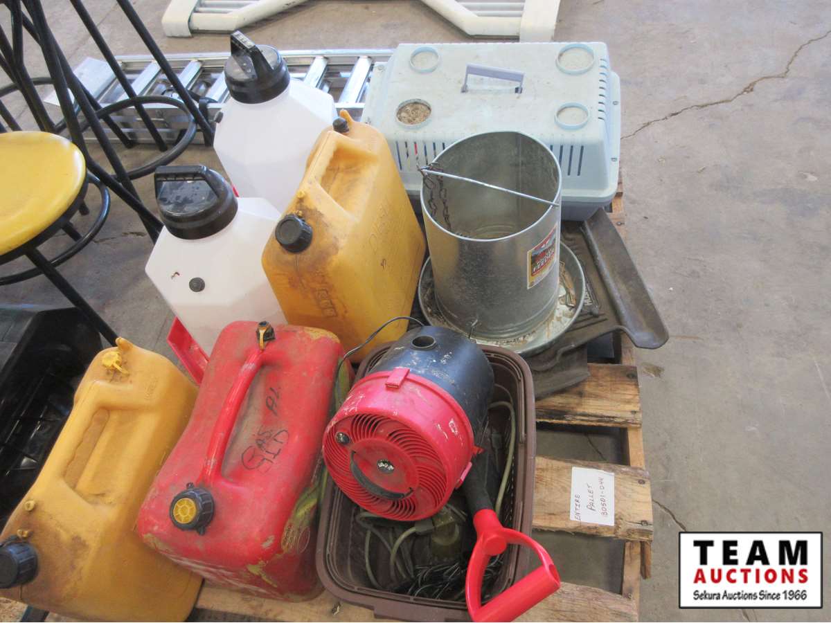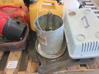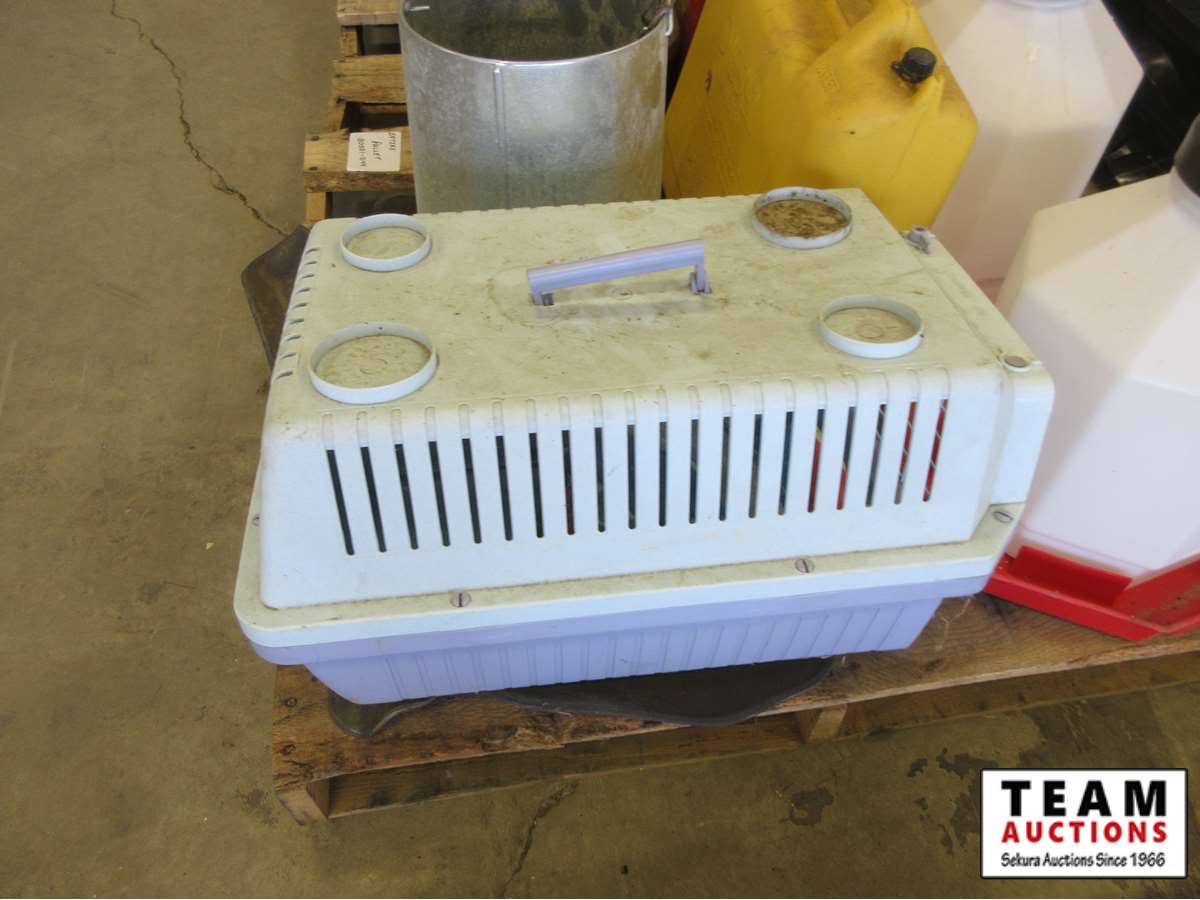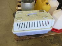 (3) chicken feeders, jerry cans, pet carrier, floor matts & miscellaneous