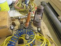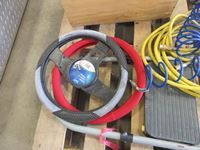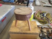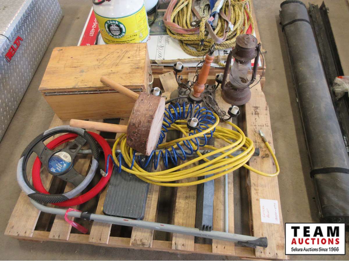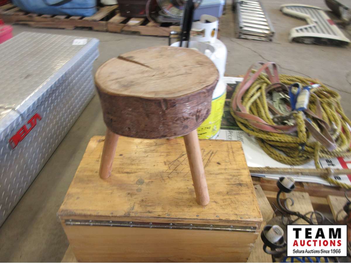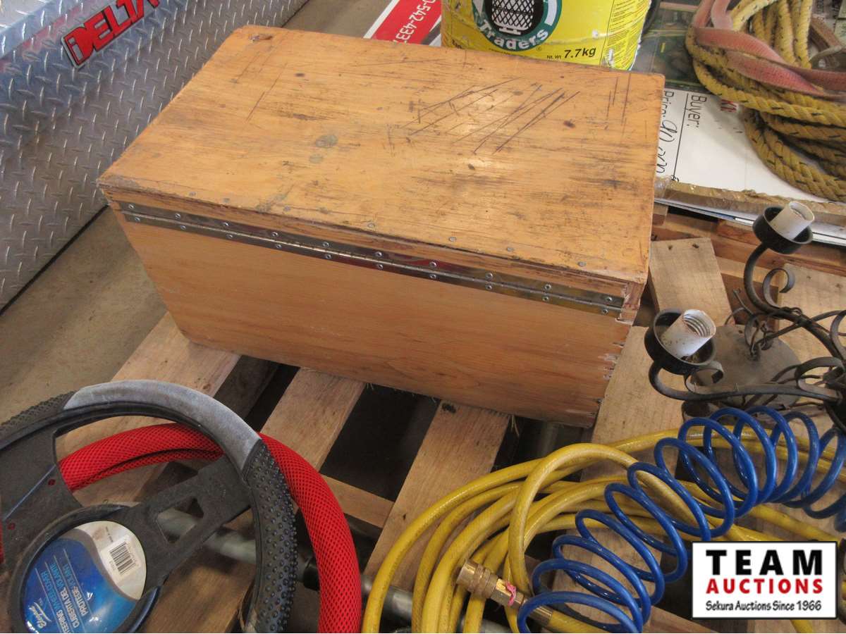 air hose, old lantern, step ladder, wood stool, (2) steering wheel covers, wooden box