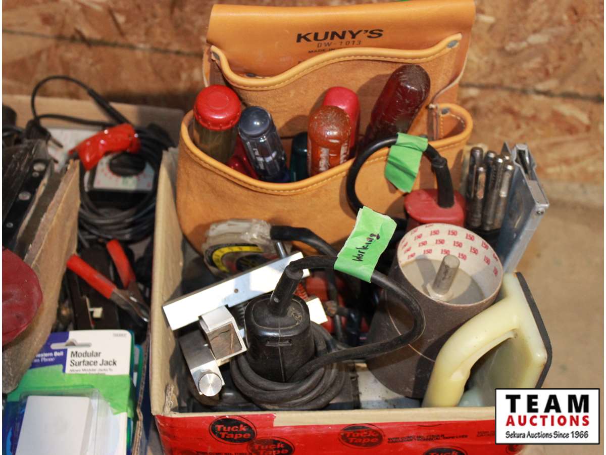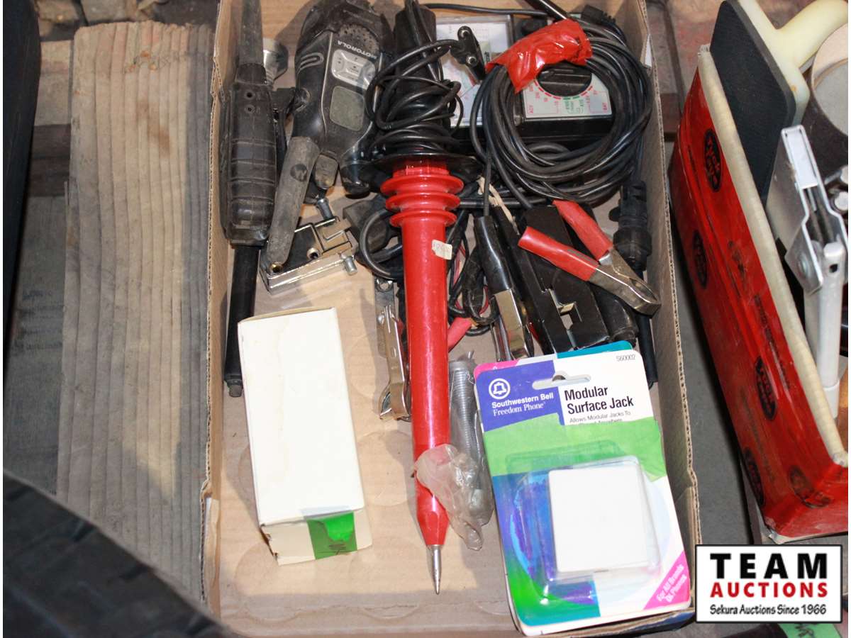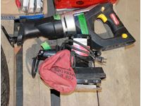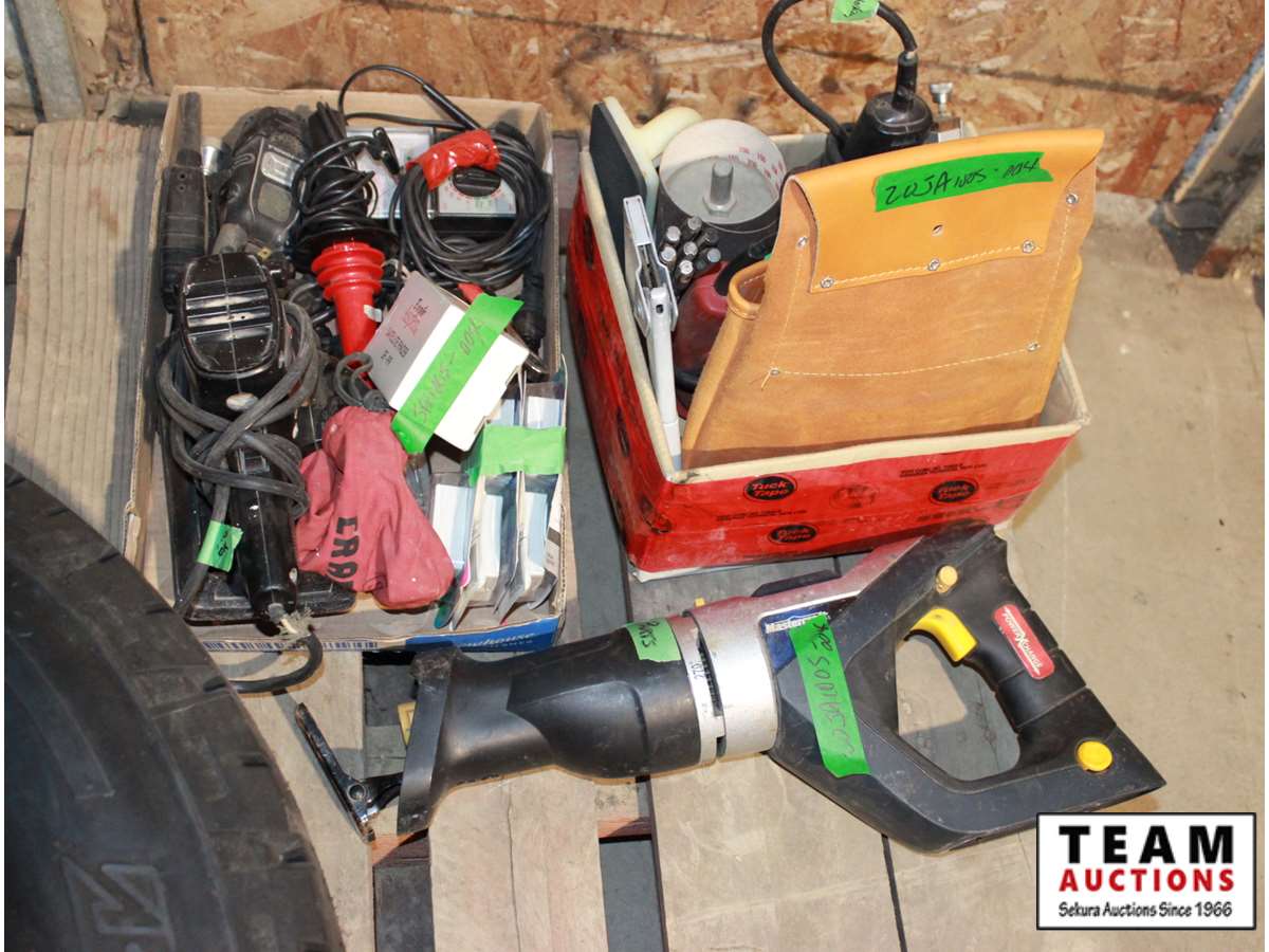 reciprocating saw no battery, soldering iron, Motorola hand held radio, battery tester, tool pouch w/screwdrivers, misc.