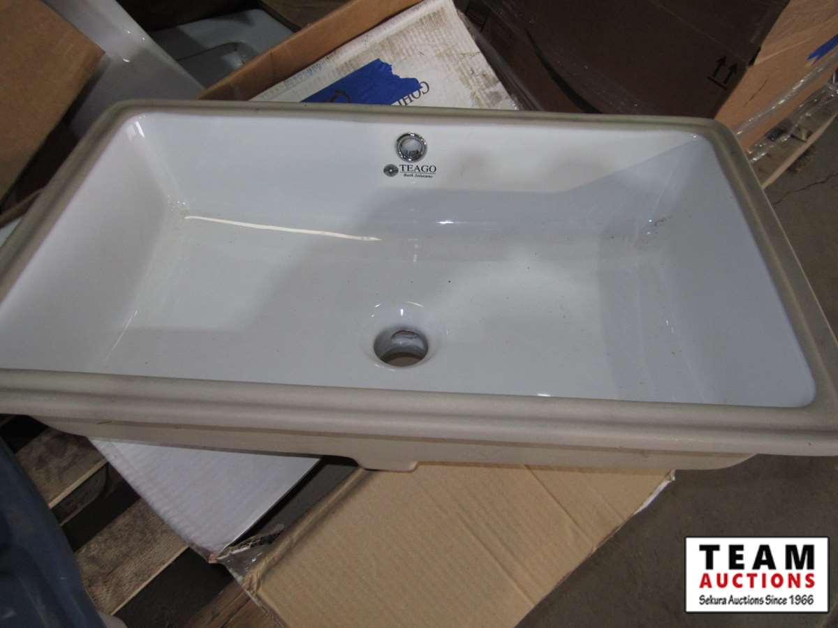 (2) new white Teago L-1690 rectangle undermount sinks, (1) new Darfield urinal
