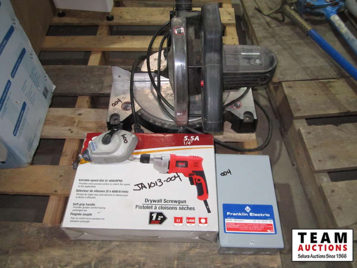 (1) drywall screw gun, Franklin Electrical Box, Irwin plumb line, mitre saw