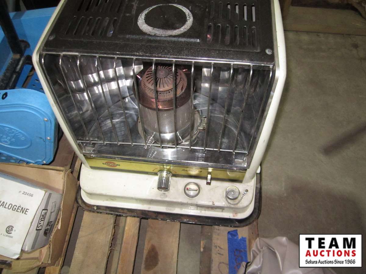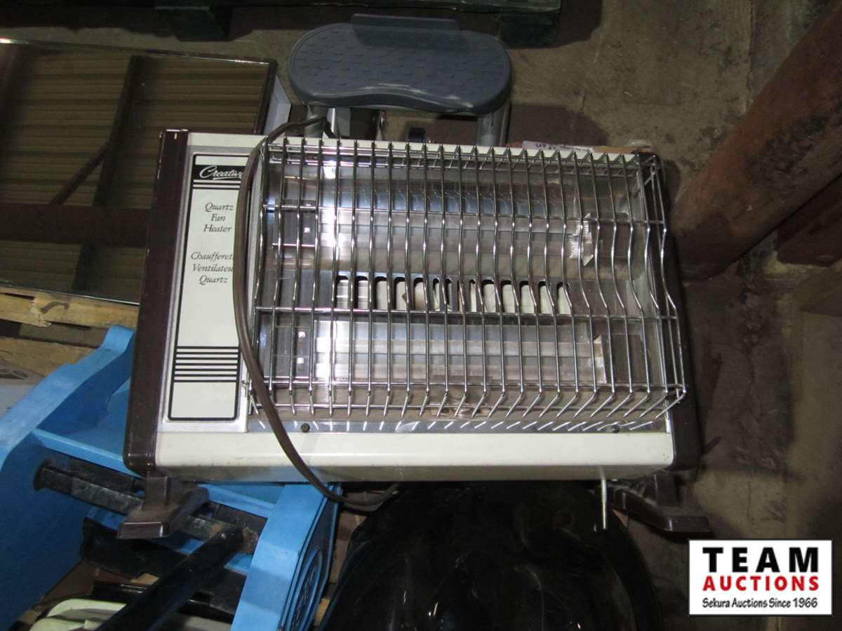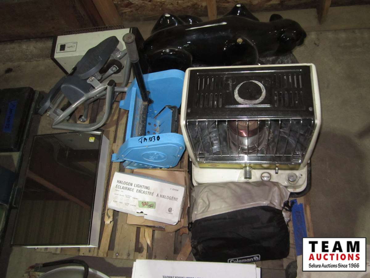 Kerosun kerosene heater, Coleman inflatable bed, recessed hydrogen light, black panther table base - no glass, mop wringer, 14" x 20" recessed medicine cabinet, quartz fan heater, step exerciser