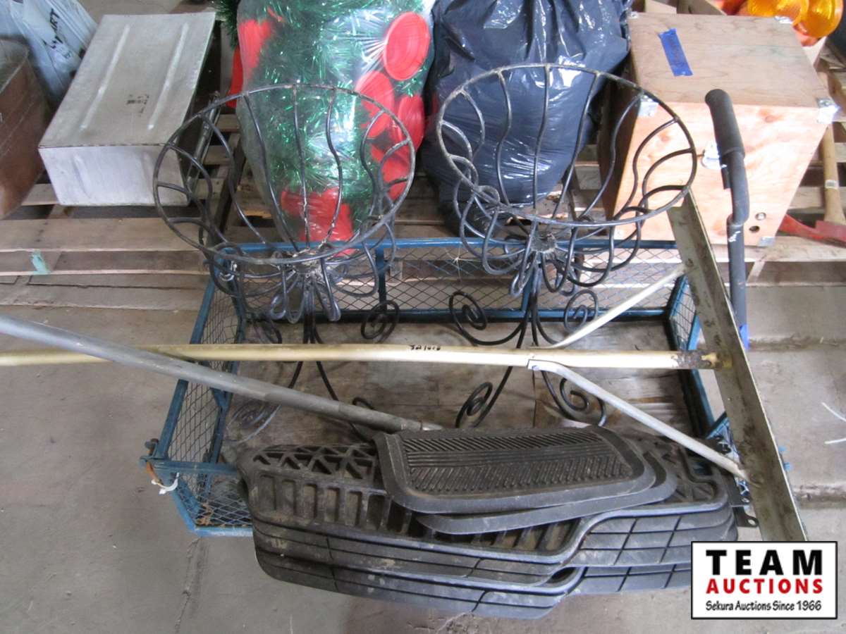 car floor mats, plant stands, squeegee, square metal basket