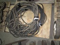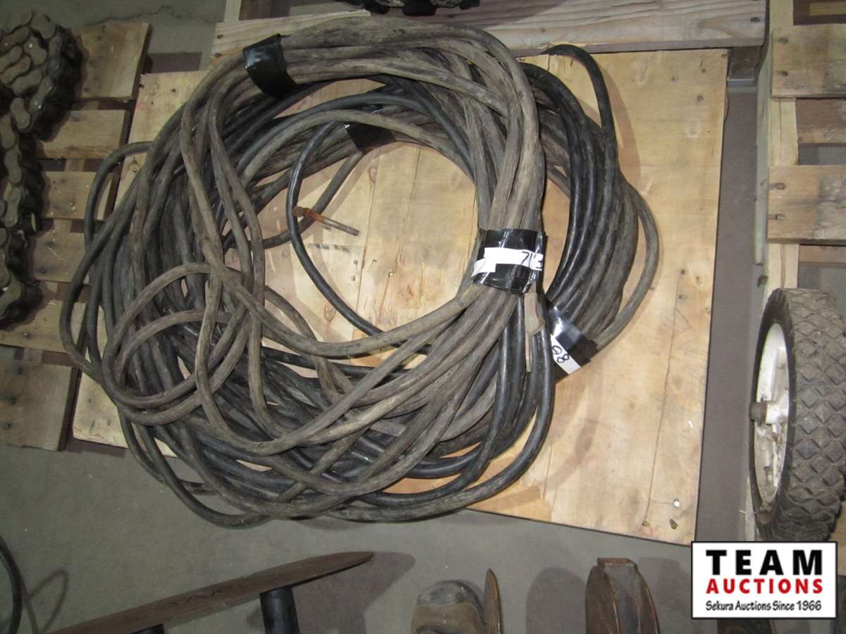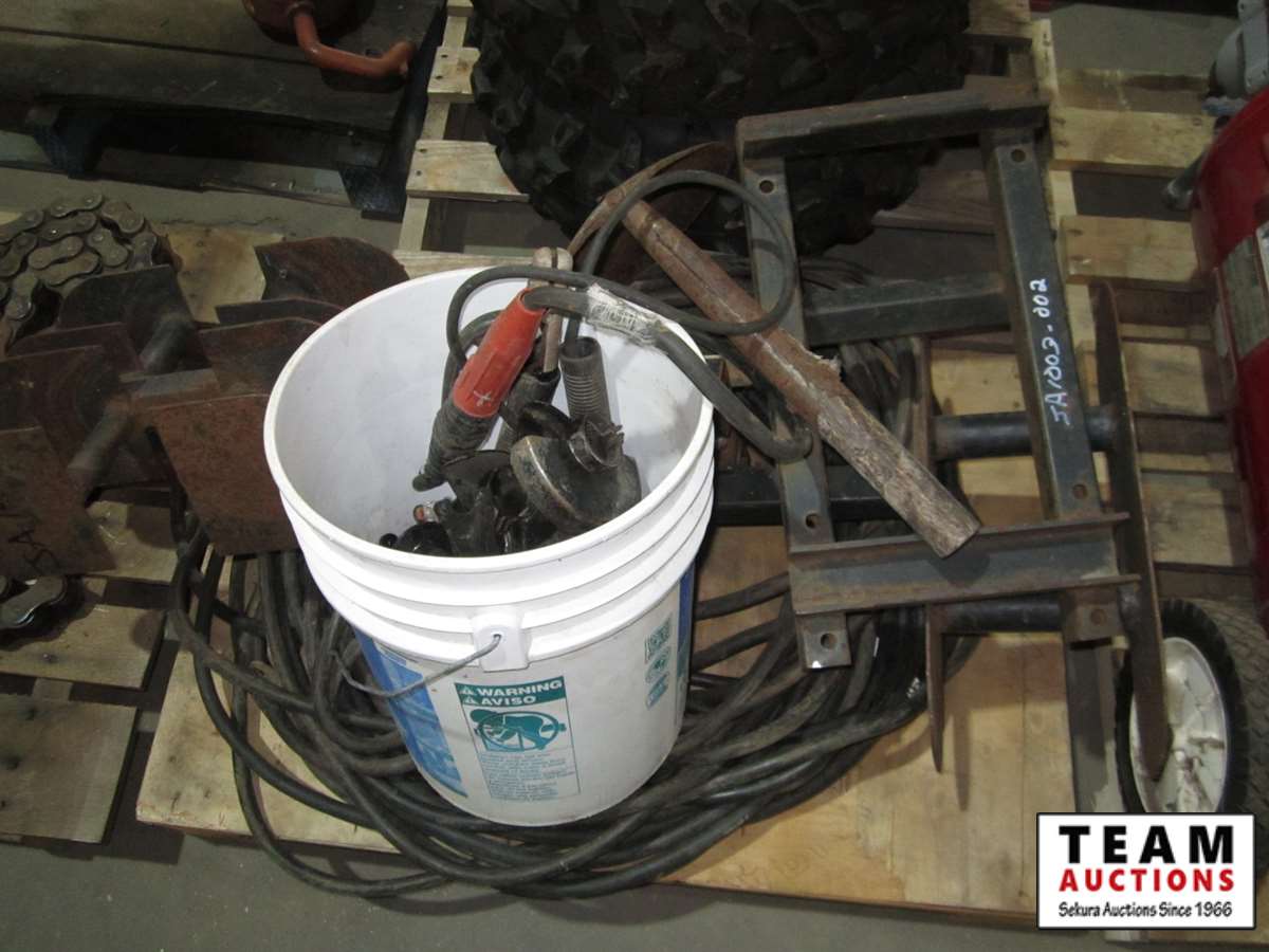 71' & 86' welding cables, (2) welding wire spools, bucket of grinder parts