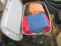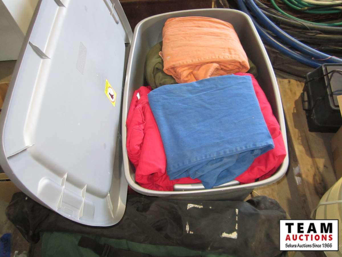 coolers, folding outdoor chairs, large tote of coveralls,
