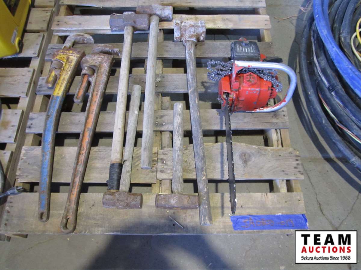 (2) 30" pipe wrenches, (5) sledge/mallet hammers, (1) Homelite chainsaw