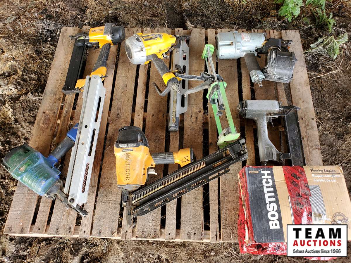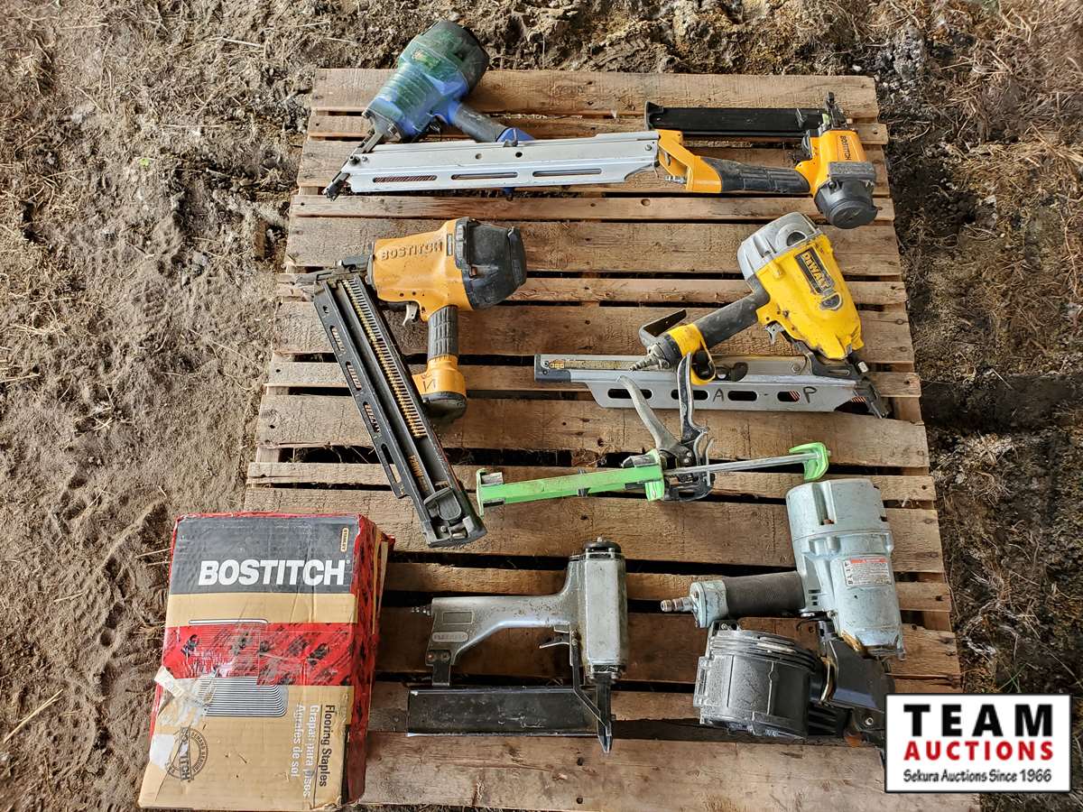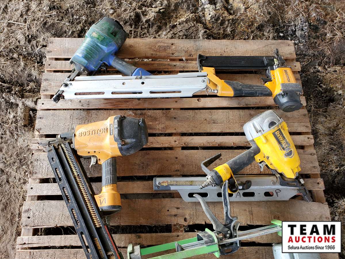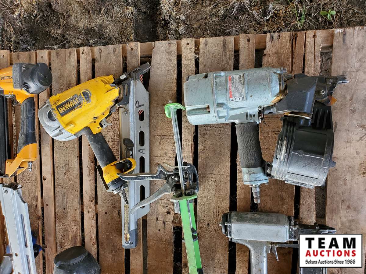 2 Dewalt nailers, 1 Bostitch nailer, 1 Campbell Hausfeld nailer, 2 misc nailers, 2 packs of nails