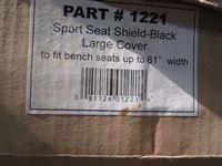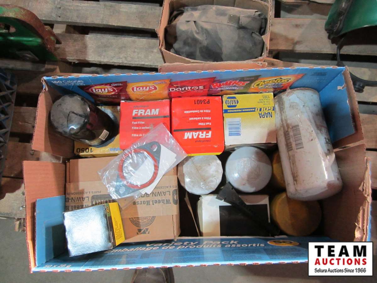 box of various tractor filters, box w/seat cover