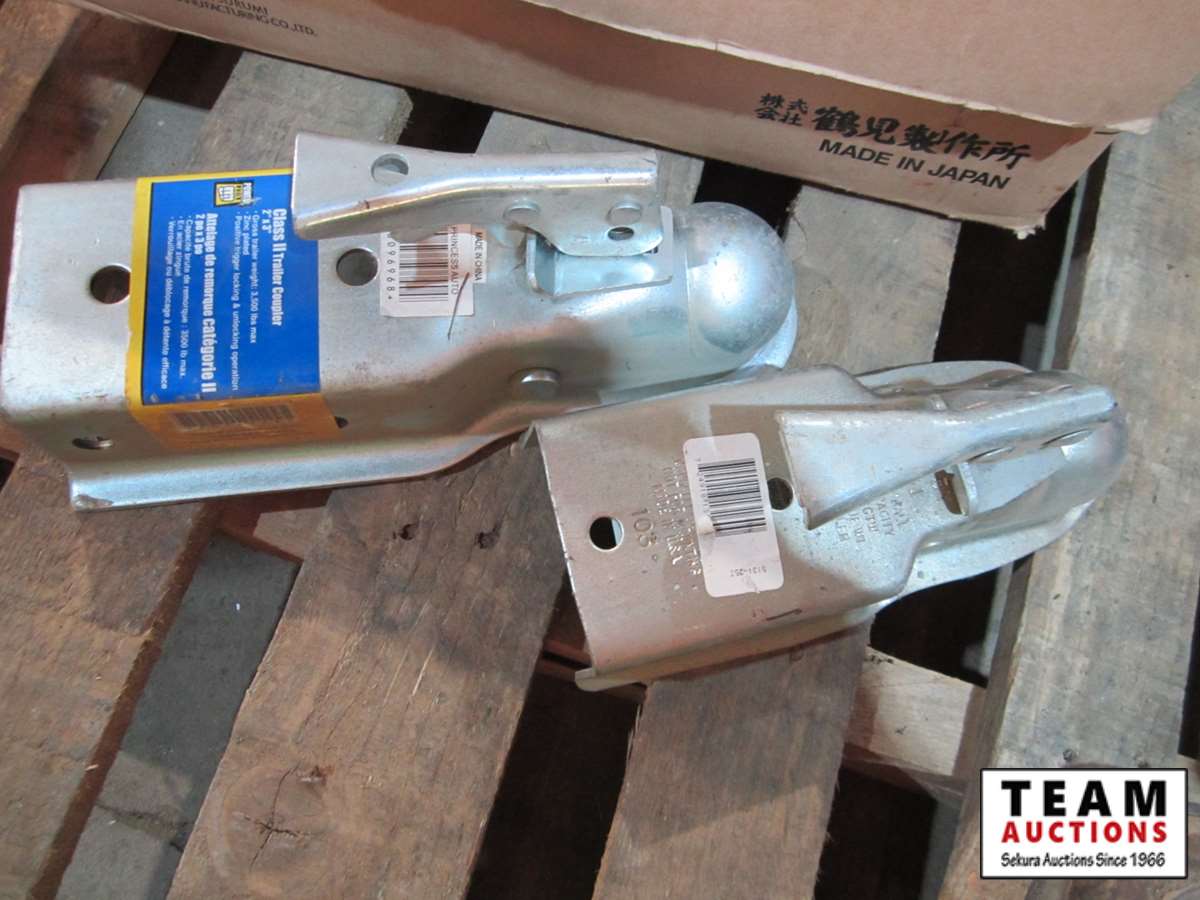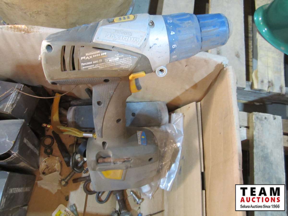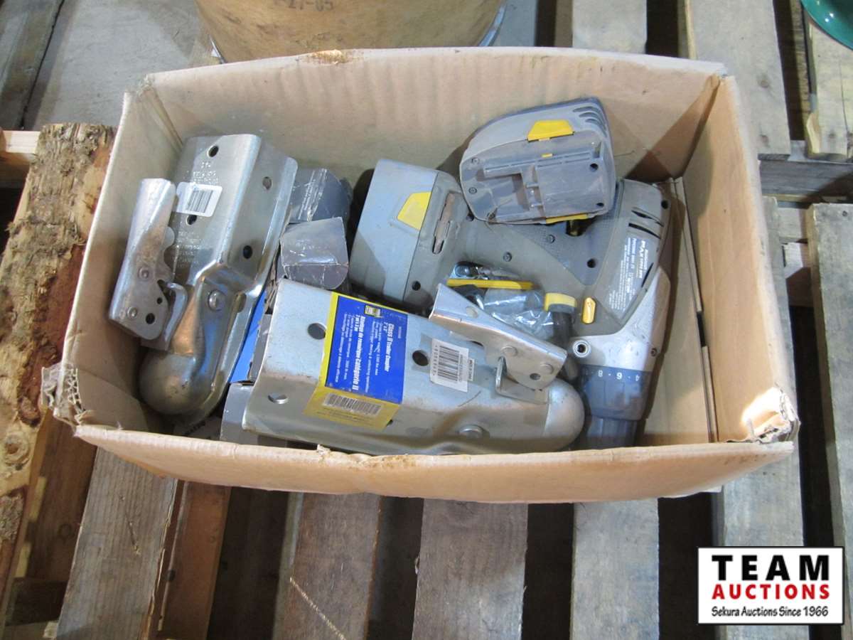 2" & 1 7/8" trailer hitches, Mastercraft Maxxim cordless drill w/2 batteries no charger, misc.
