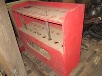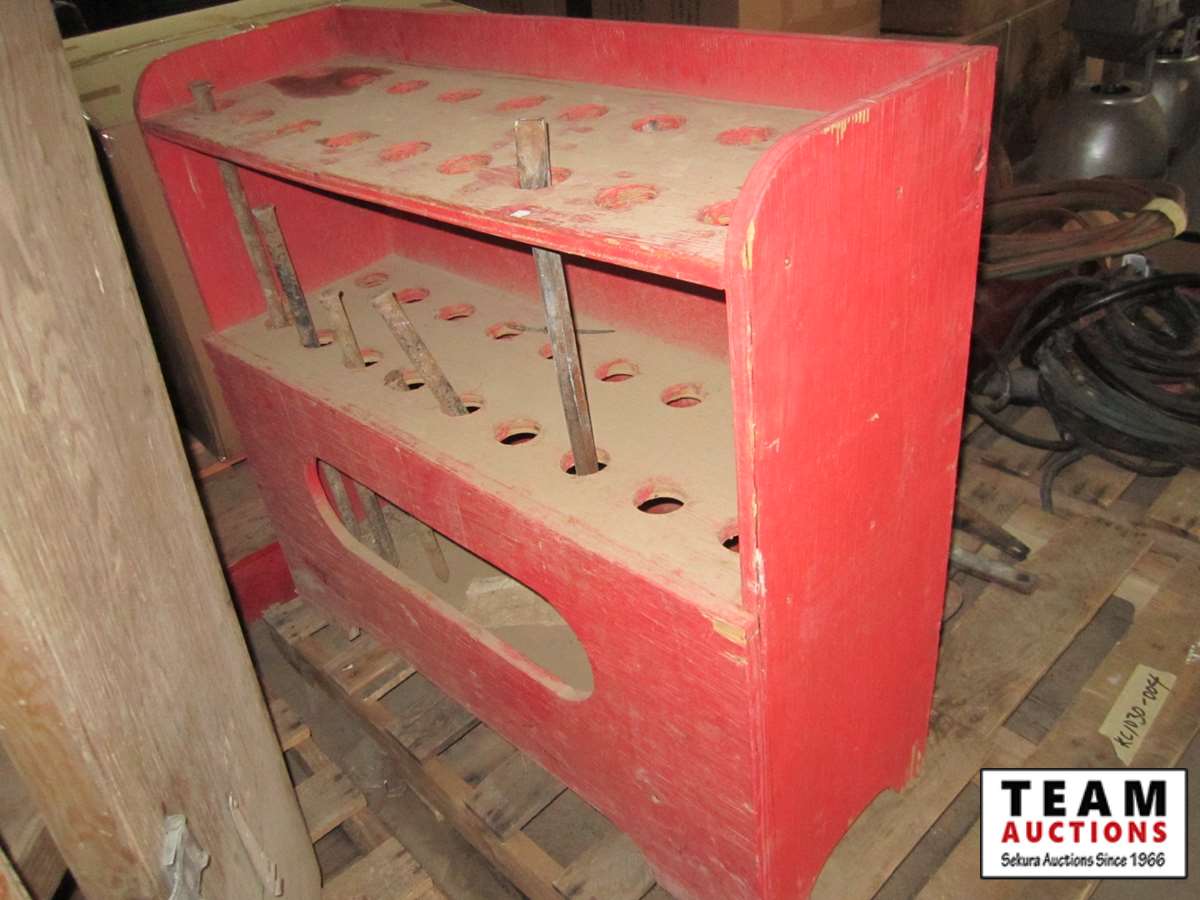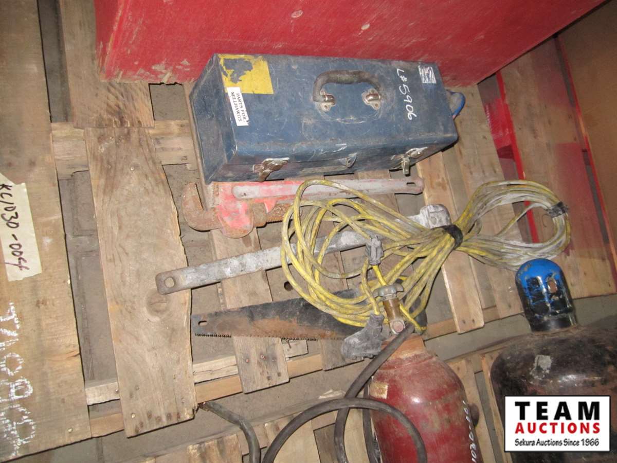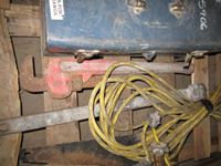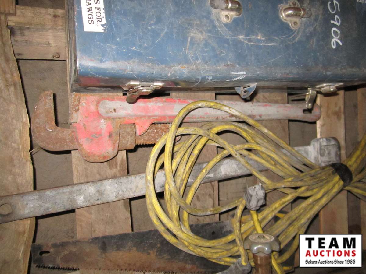 red wooden cabinet, blue tool box, extension cord pipe wrench