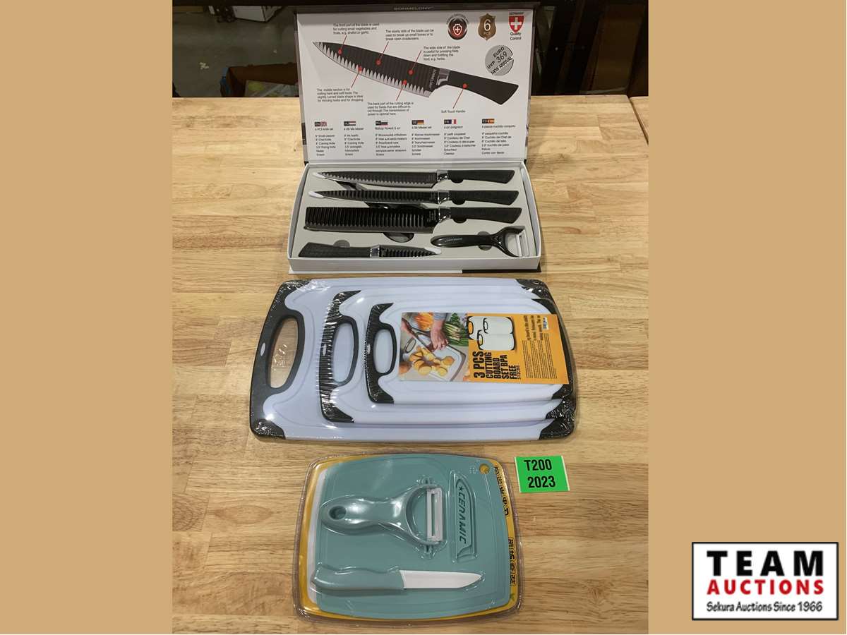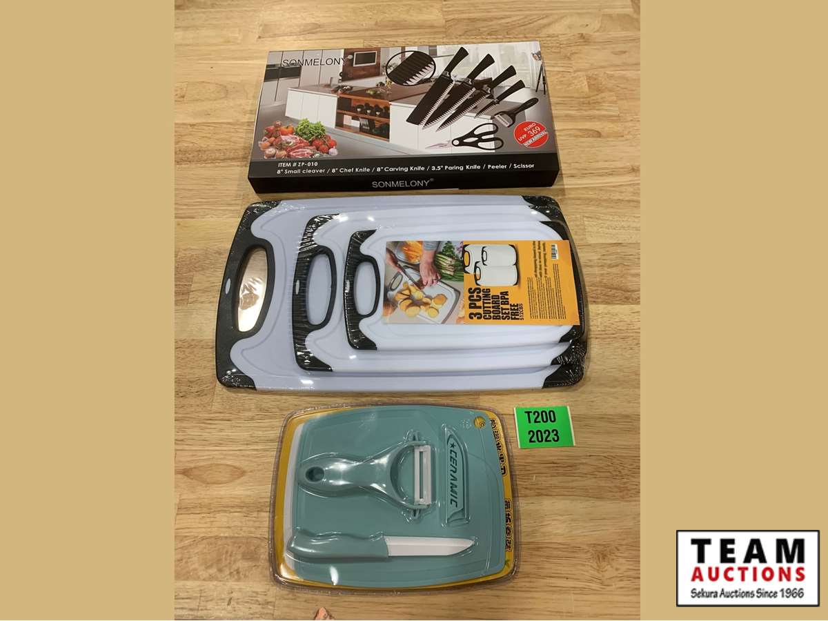 223 Sonmelony Knife Set, 3 Pc Cutting Board Set BPA Free & Ceramic Peeler and Knife
