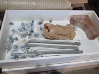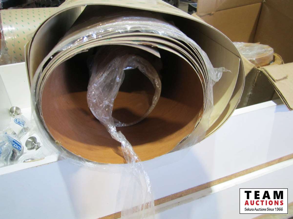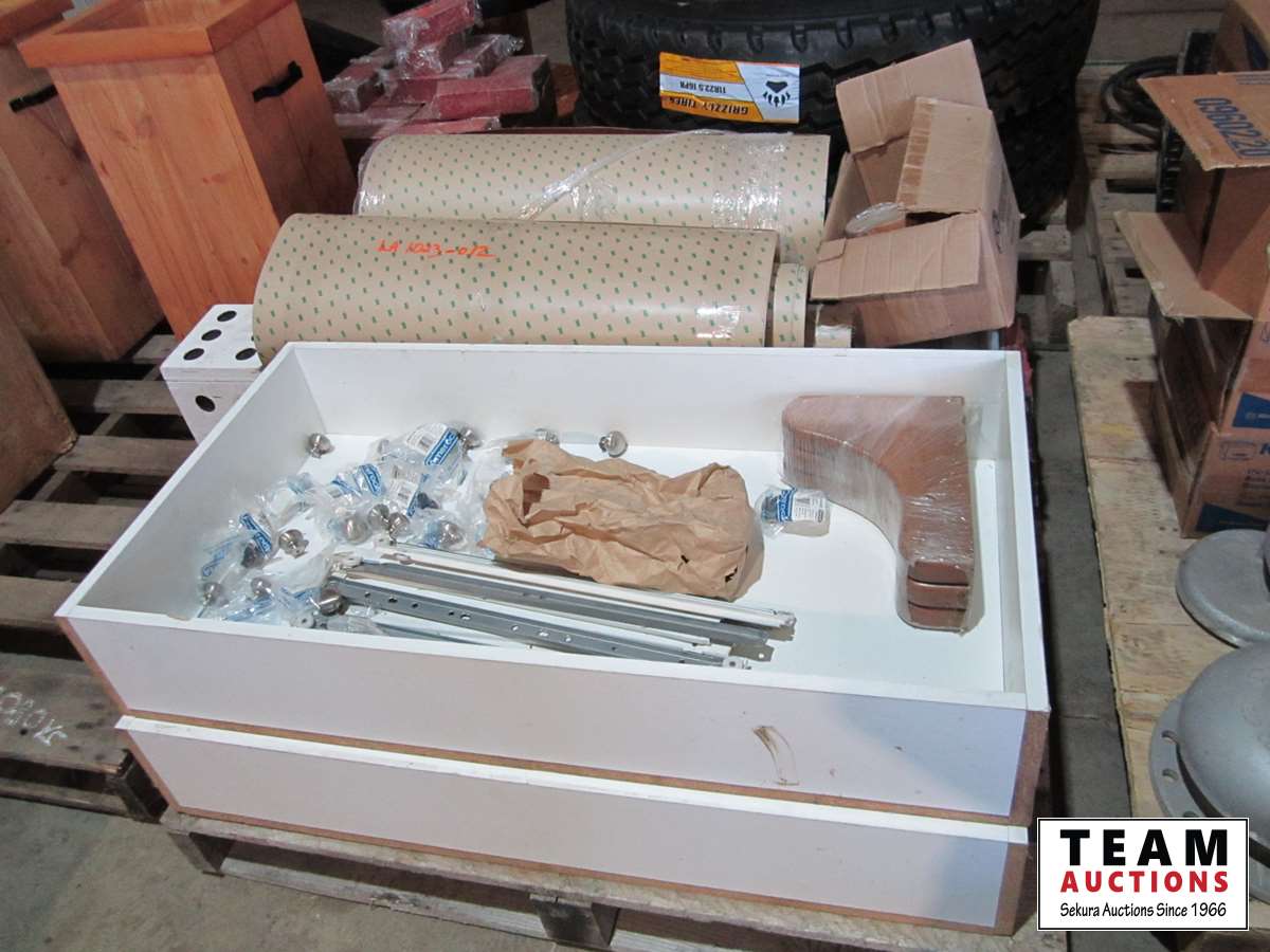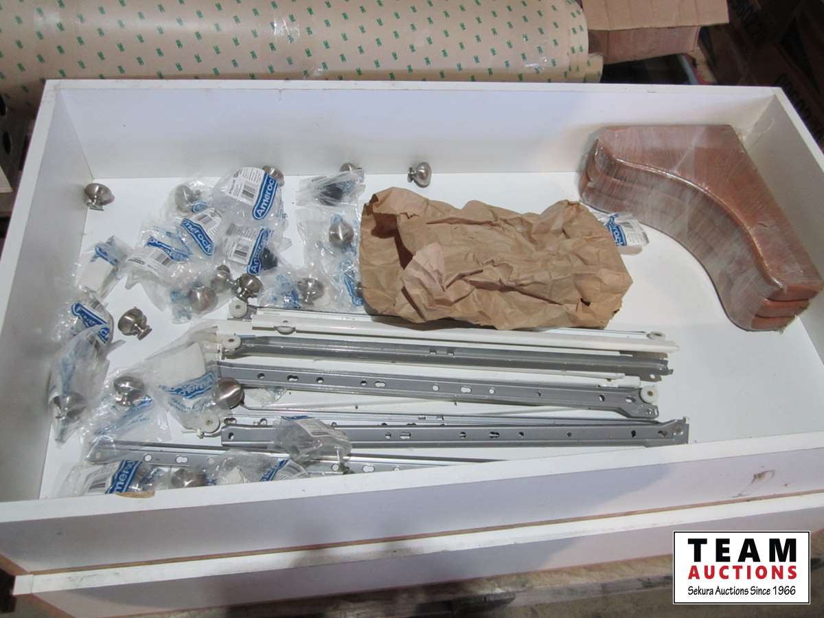 drawers 20"W x 37"L x 6.5"D, drawer pulls, hardware, misc. rolls of veneer, wooden corner brackets, exterior window 28" x 25.75" outside measurement