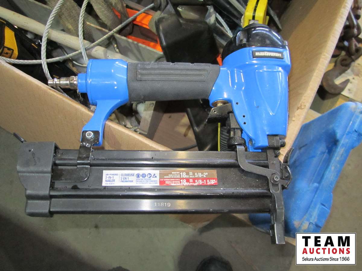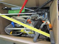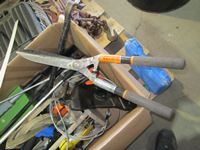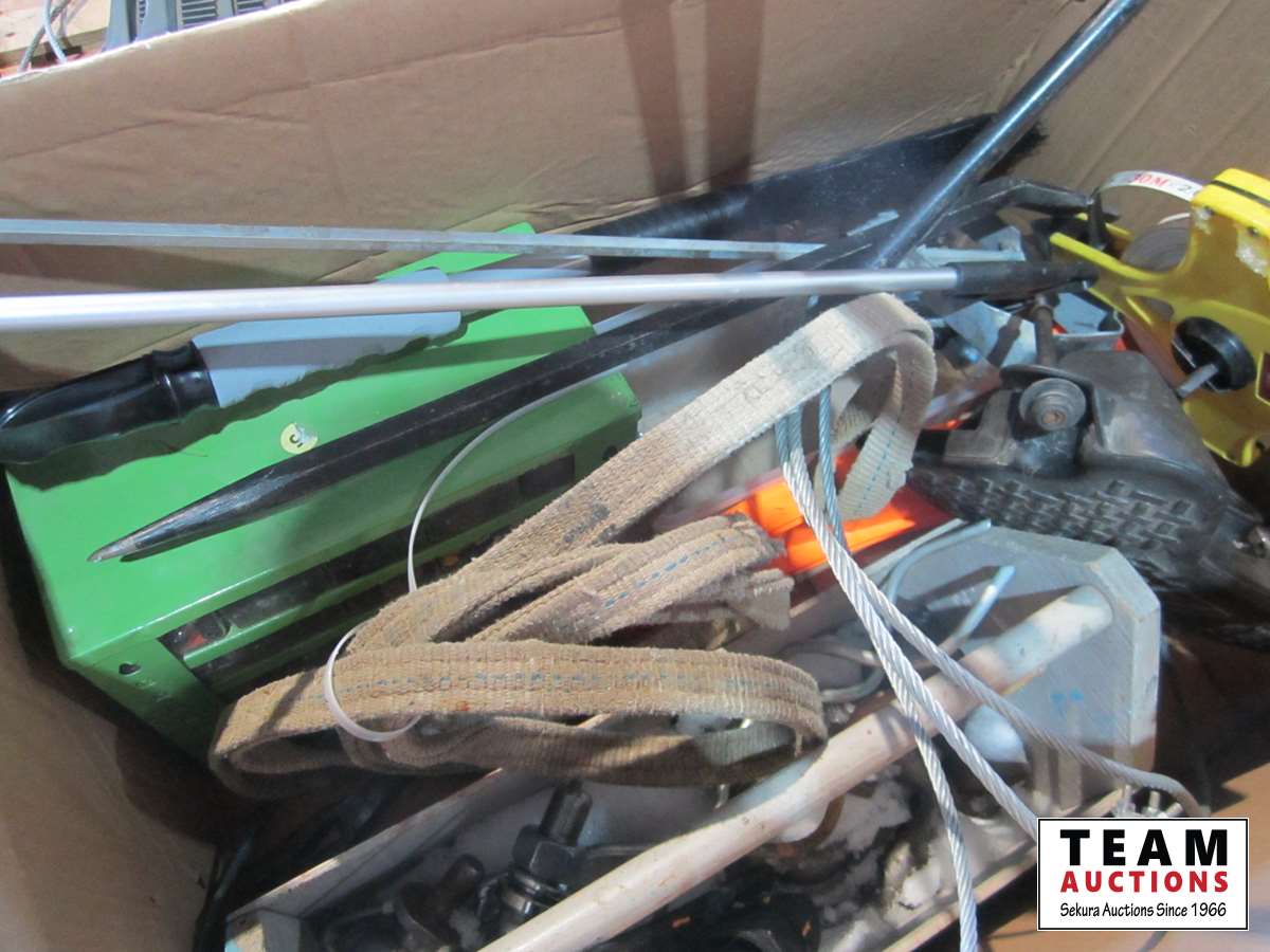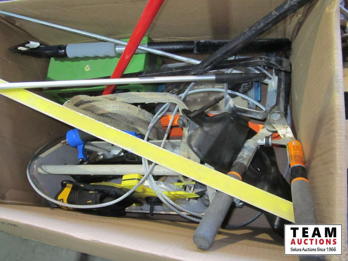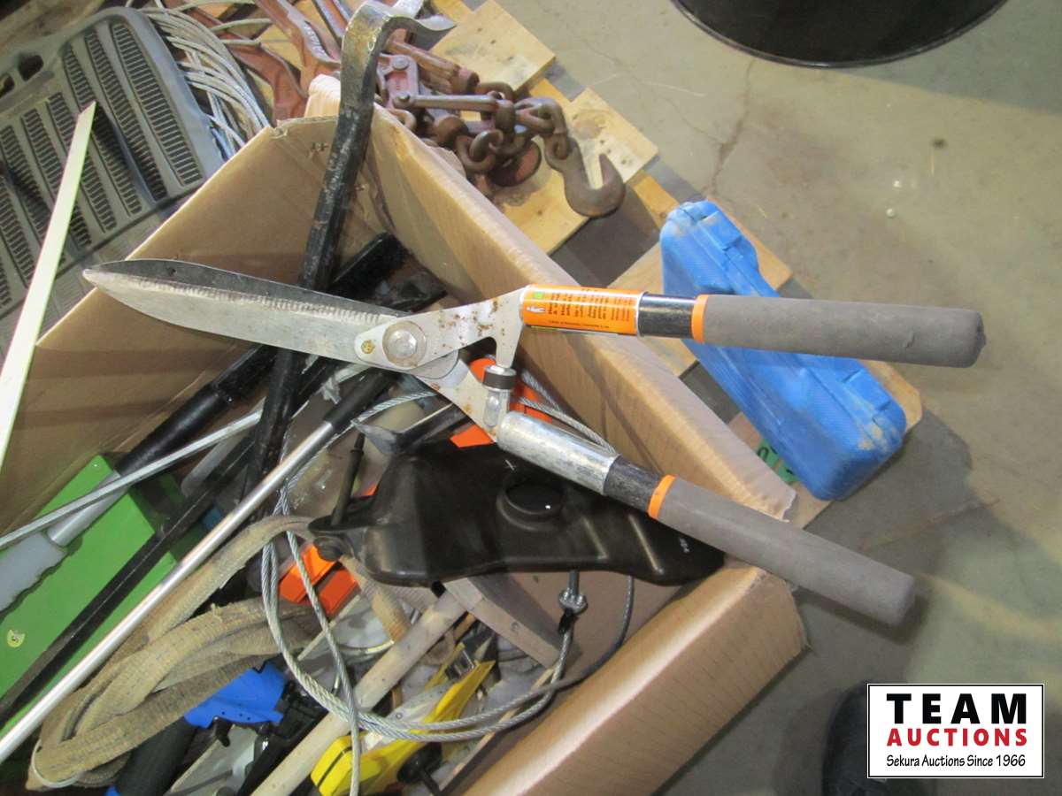 load binders, car floor matts, misc. cable/wire, drill bit/socket set, box w/misc. tools, hedge trimmers, tape measure, 2in1 nailer, misc.