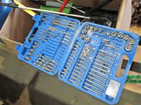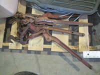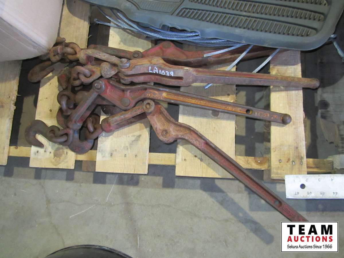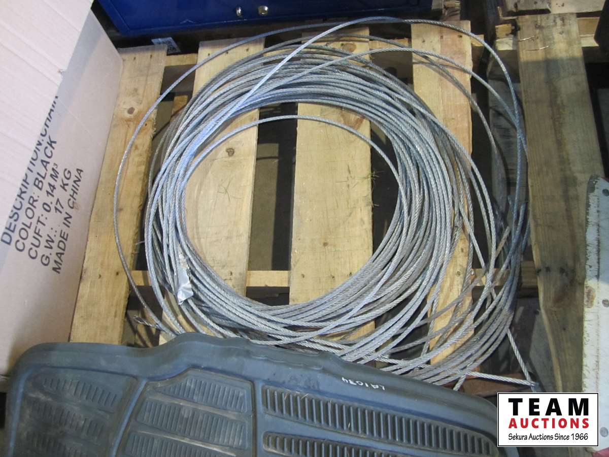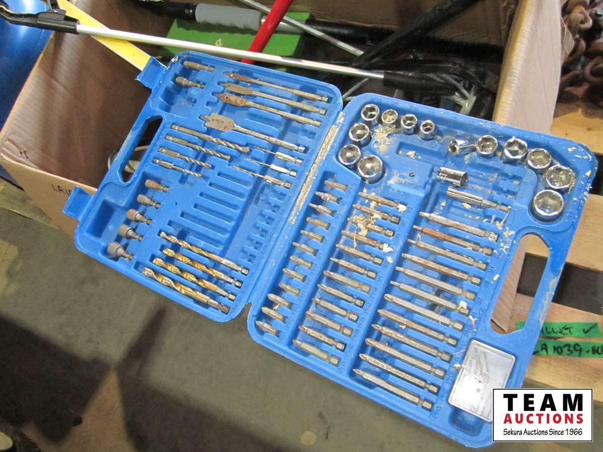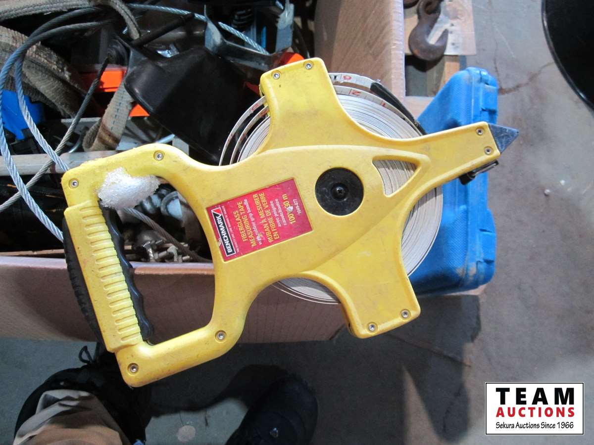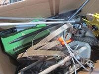 load binders, car floor matts, misc. cable/wire, drill bit/socket set, box w/misc. tools, hedge trimmers, tape measure, 2in1 nailer, misc.