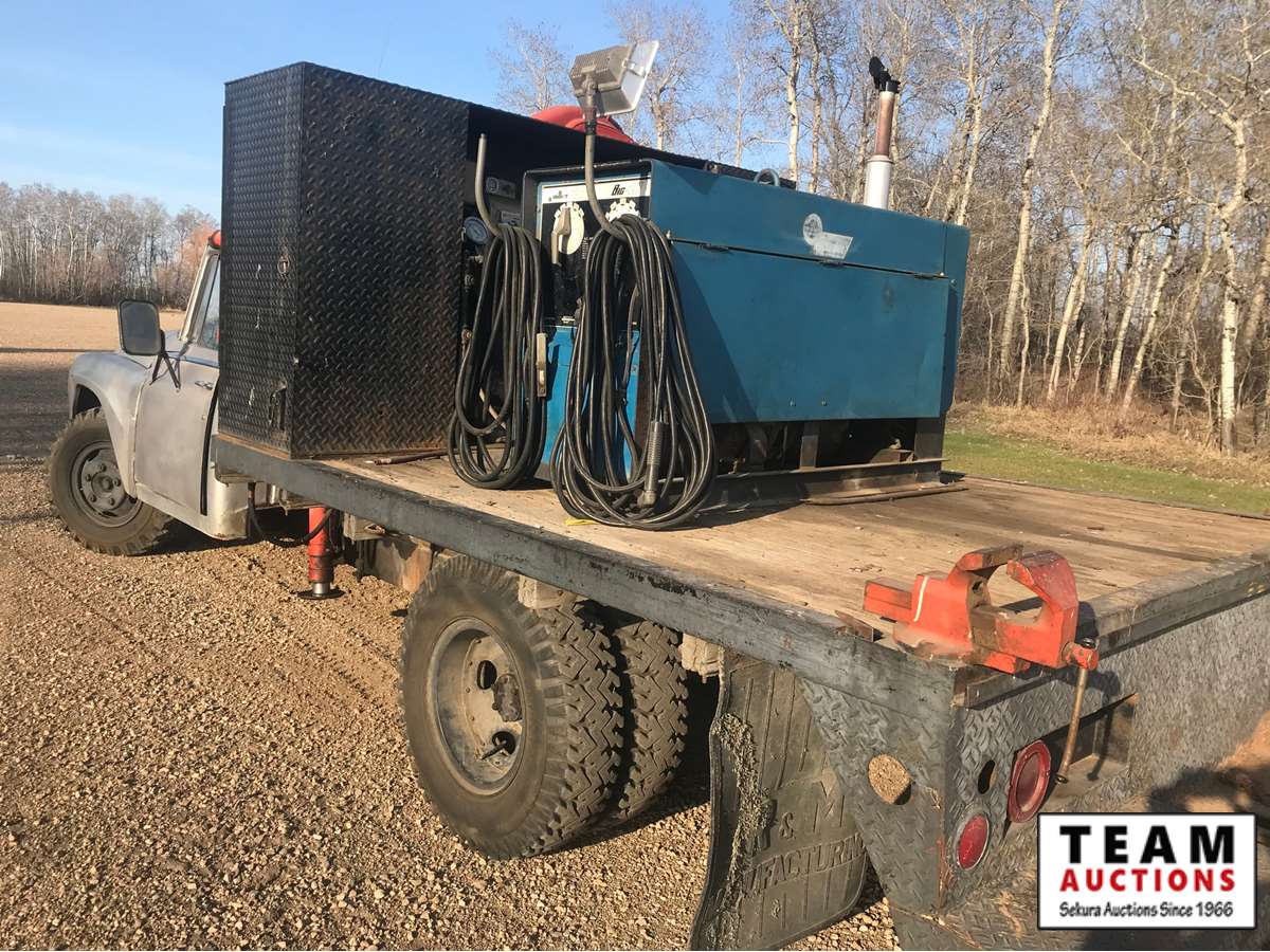 V8 gas engine, 4 speed transmission, rear duals, Hioab knuckle boom picker, Miller B-40 gas driven welder with built in generator, Ingersol Rand MK-8 gas driven air compressor, tool cabinet, rear vice
