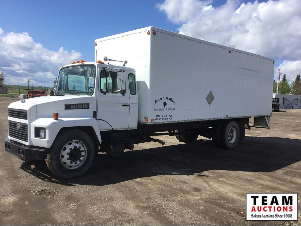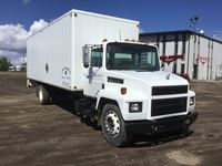 Mack 6 cylinder engine, 6 speed standard transmission, air brakes, spring suspension, 24' Intercontinental dry van box with rear roll up door, real good rubber, 351,903 kms, Alberta registered