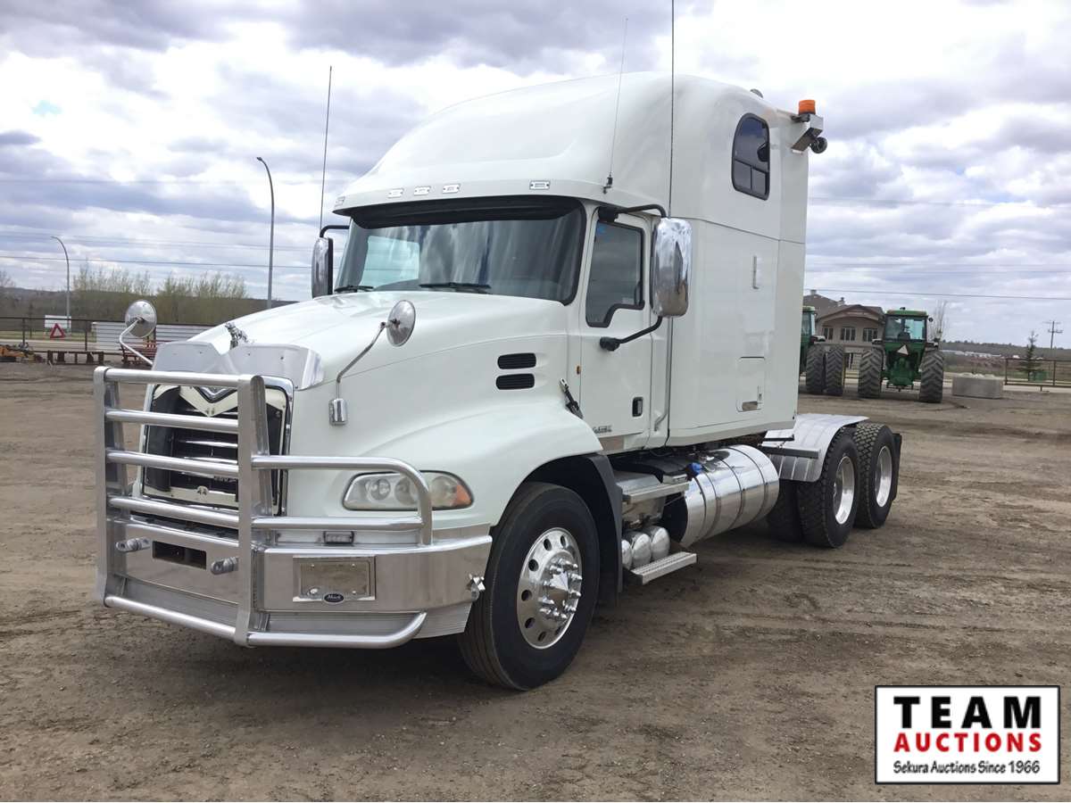 Mack Pinnacle, Mack 13L eng, Mack 18 speed transmission, Mack rears, air ride suspension, dual rear stacks, head rack, tool box, beacon lights, front rue bar, aluminum wheels, 11R24.5 real good rubber, air sliding 5th wheel, power invertor, 808663 kms, Alberta CVIP, Alberta registered