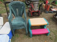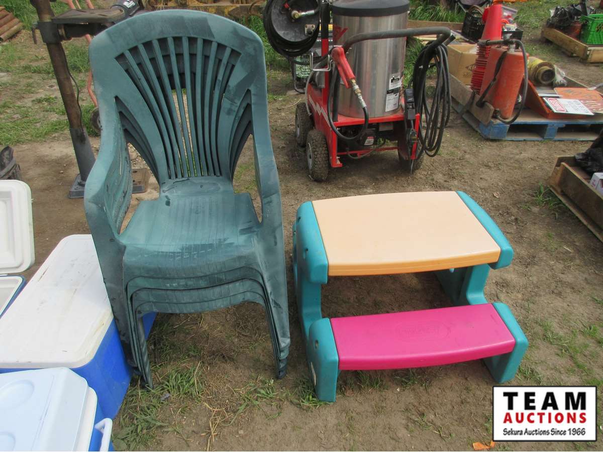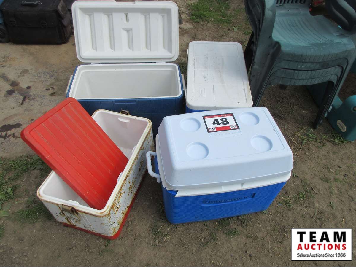 48 (4) Coolers, (4) Poly Lawn Chairs, Poly Kids Picnic Table