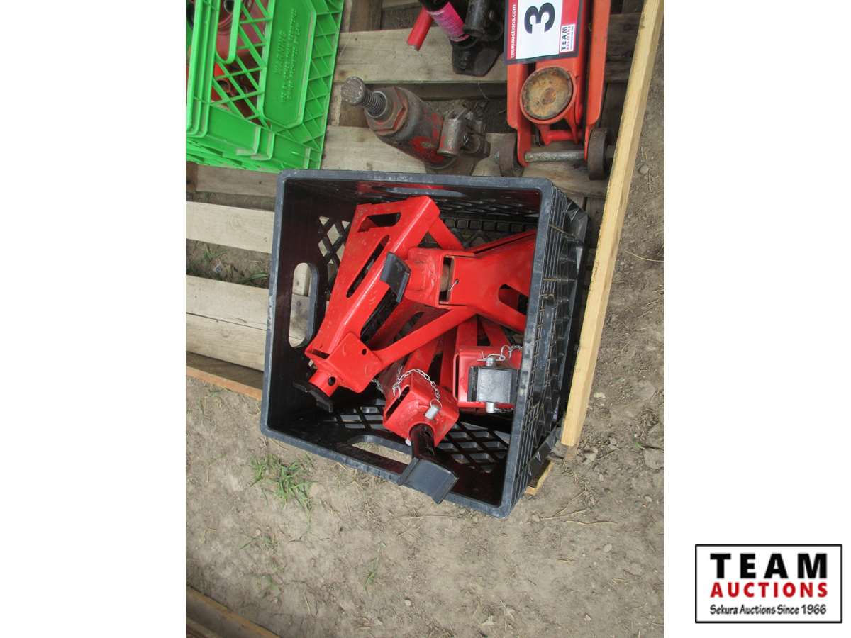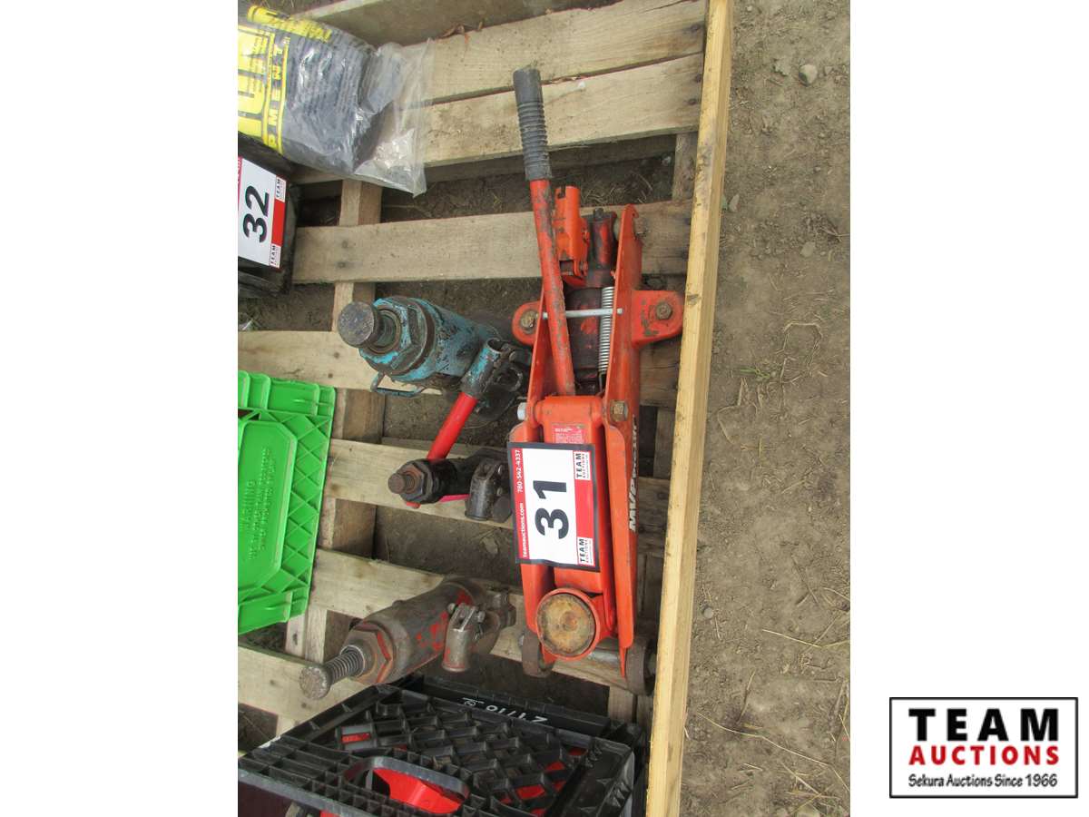 31 (4) Small jack Stands (new), Floor jack, (3) Bottle Jacks