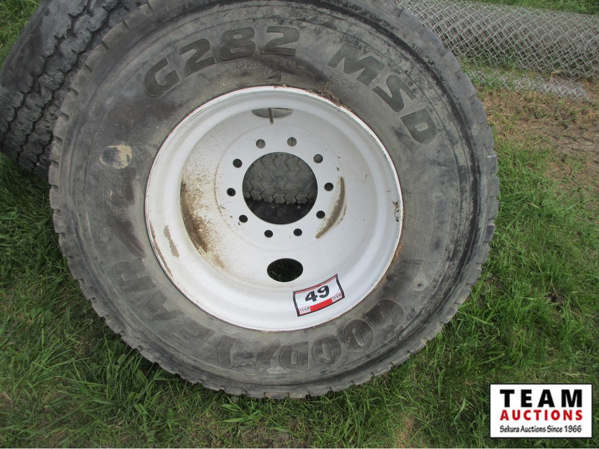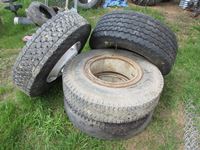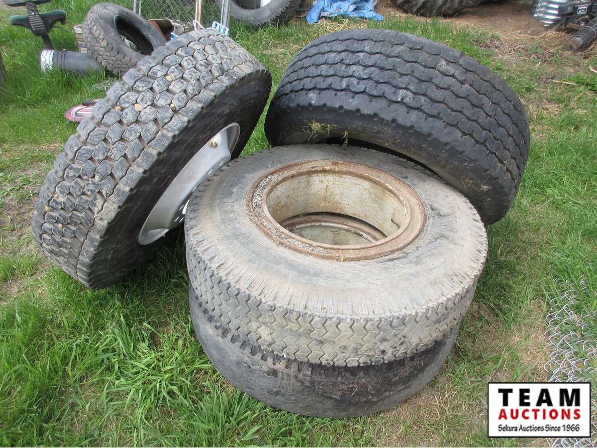 (1) new 11R22.5 tire on 8 bolt rim, (2) 10.00-20 tires on split rims, (1) 425/65R22.5