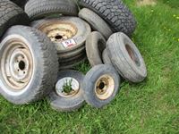 92) 7.50-16 frt tractor tires on rims, (2)Hercules 245/75R16 good tires, assortment of smaller tires