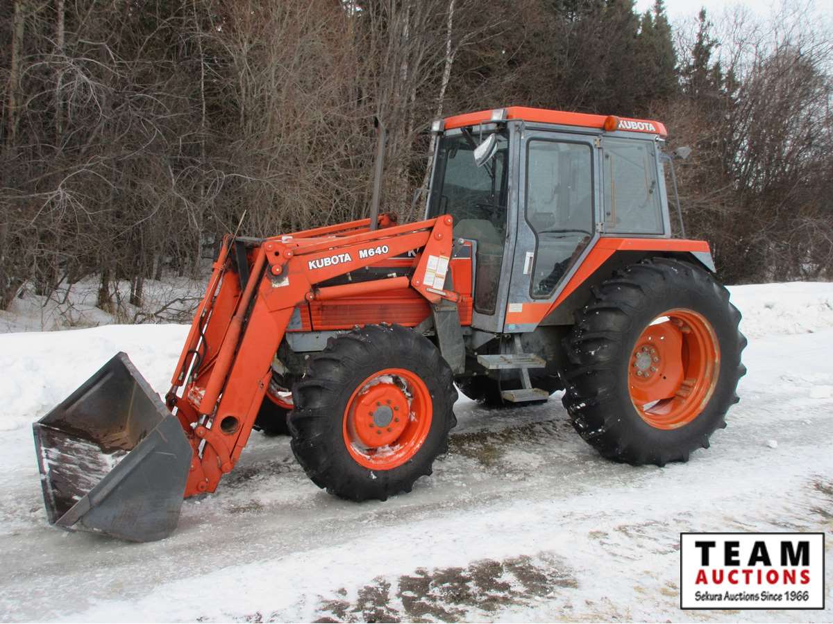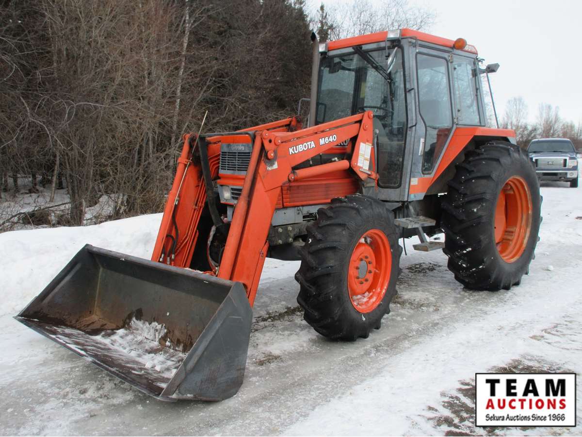 Kubota M640 Loader, 80" bucket, joystick, Cab, heat, AC, 12 speed synco shuttle transmission, 3 Pt hitch, 540/1000 pto, (2) sets hydraulic outlets, 13.6-24 front & 18.4-34 rear rubber, 1654 hrs