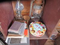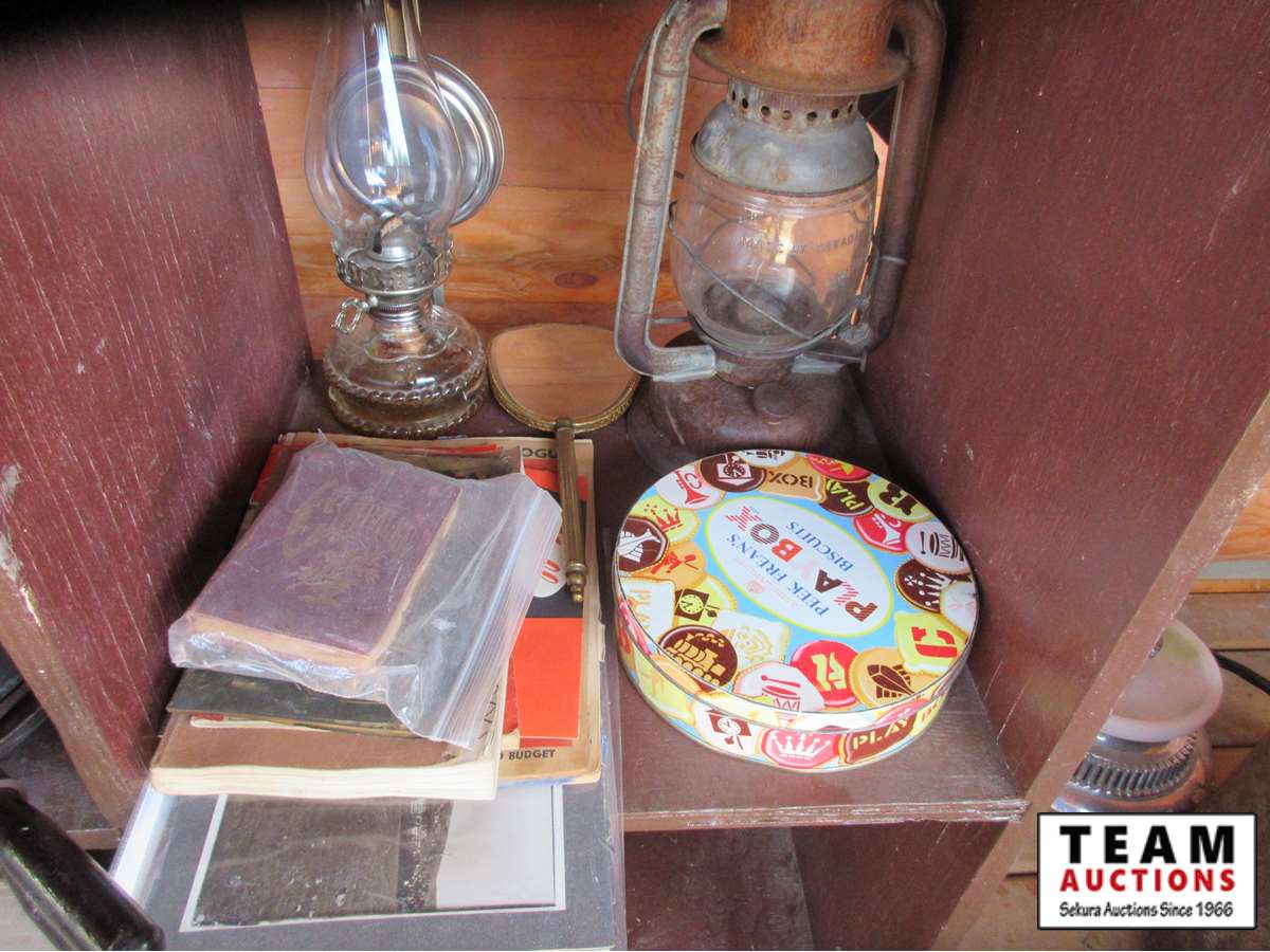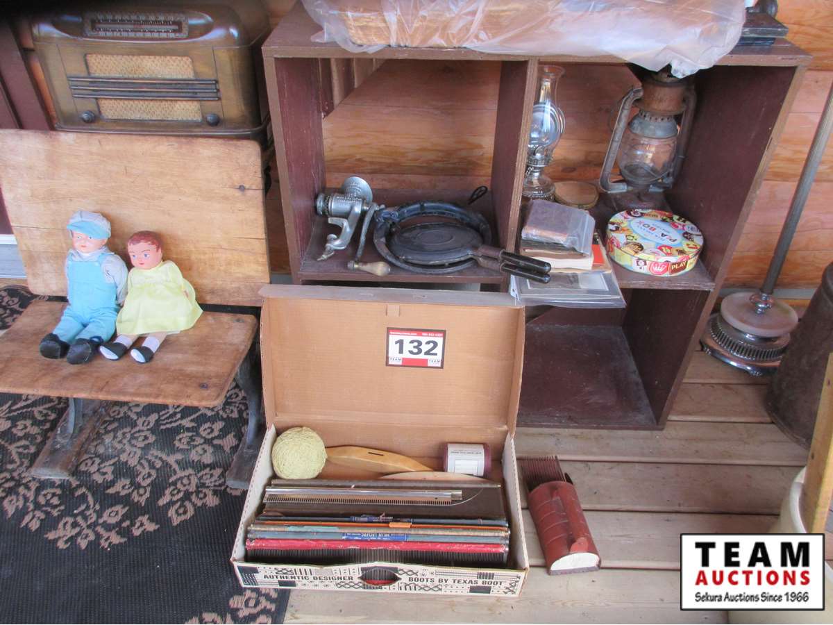 loom, almost a years worth of 1939 Edmonton Journals, (2) lanterns, waffle iron, meat grinder, Philco radio, school desk, dolls, blueberry picker