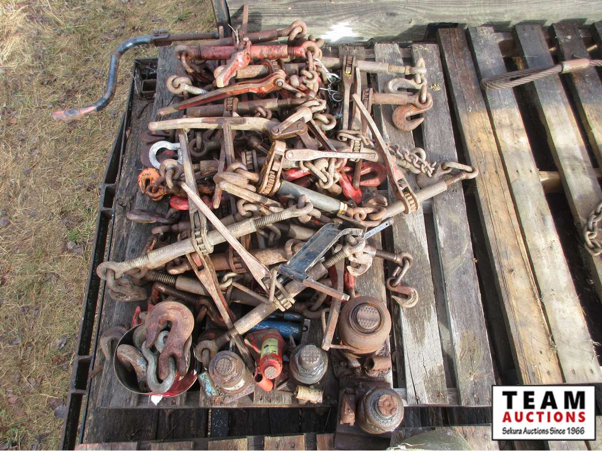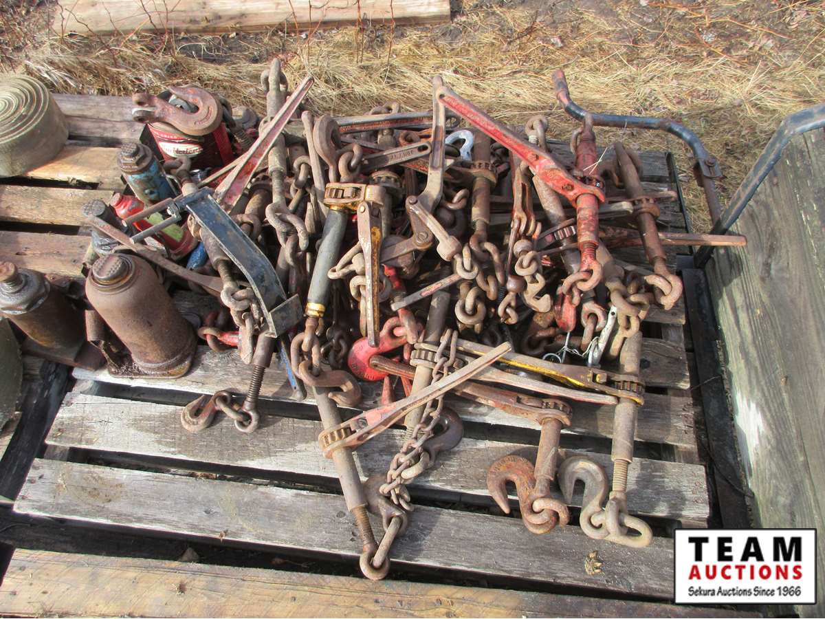 118 Pallet of Chain Boomers, Bottle Jacks, Chains, Hooks & Clevises