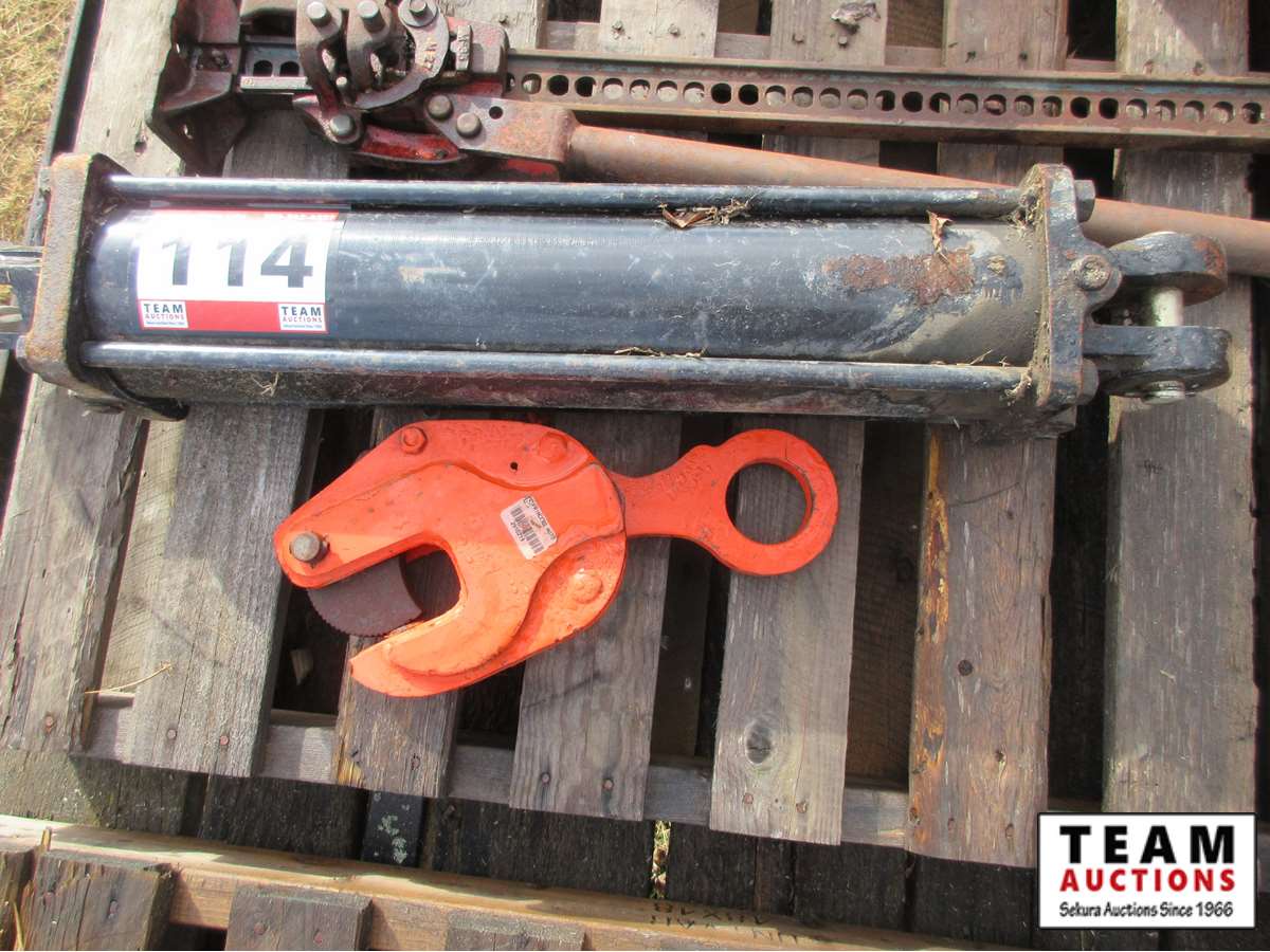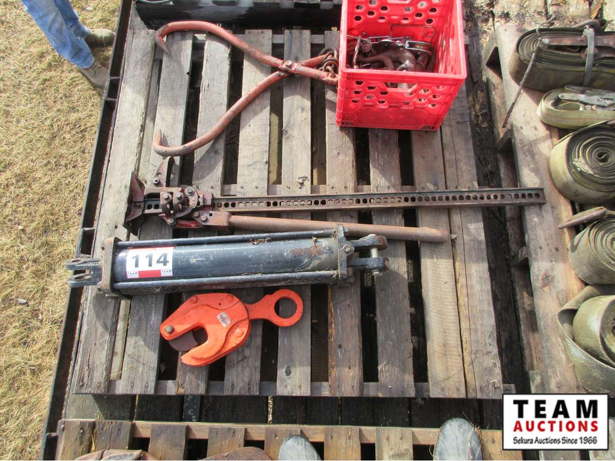 114 Pallet of Hydraulic Cylinder, Farm Jack, Sheet metal Clamp, Clevises & Pulleys, Log Tongs