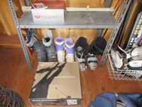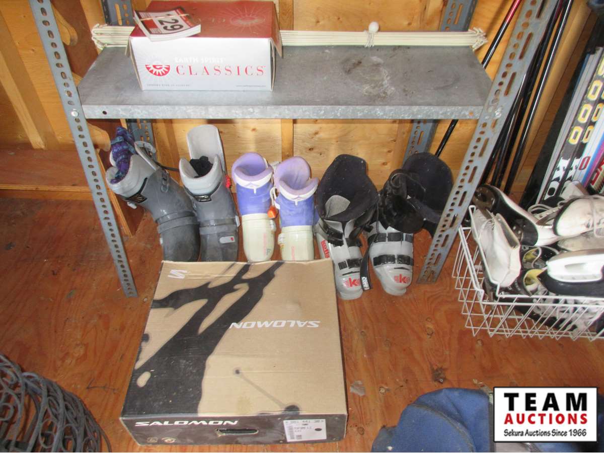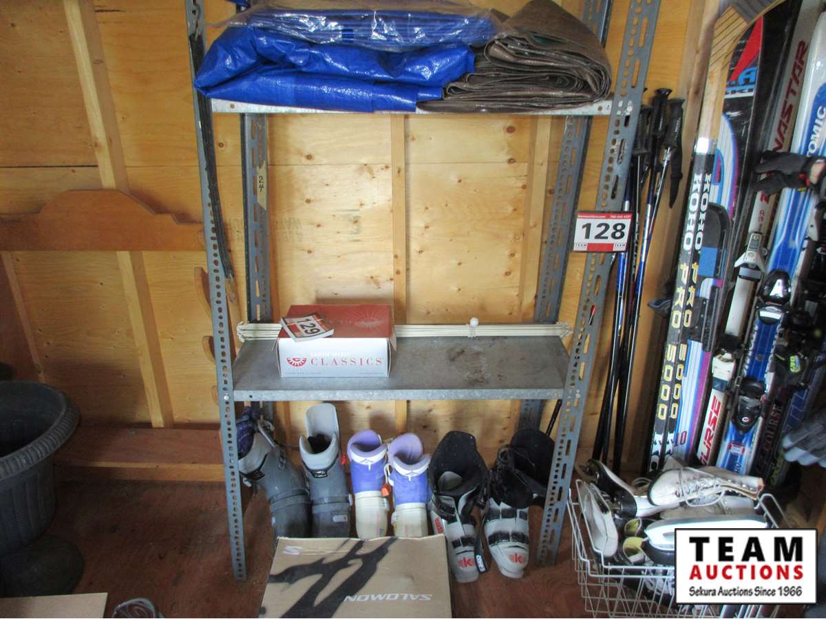 (5) pairs of downhill skis, (4) pair of ski boots, ice skates, bag of baseball equipment, bag of life jackets, (1) pair water skis, tarps, hockey sticks