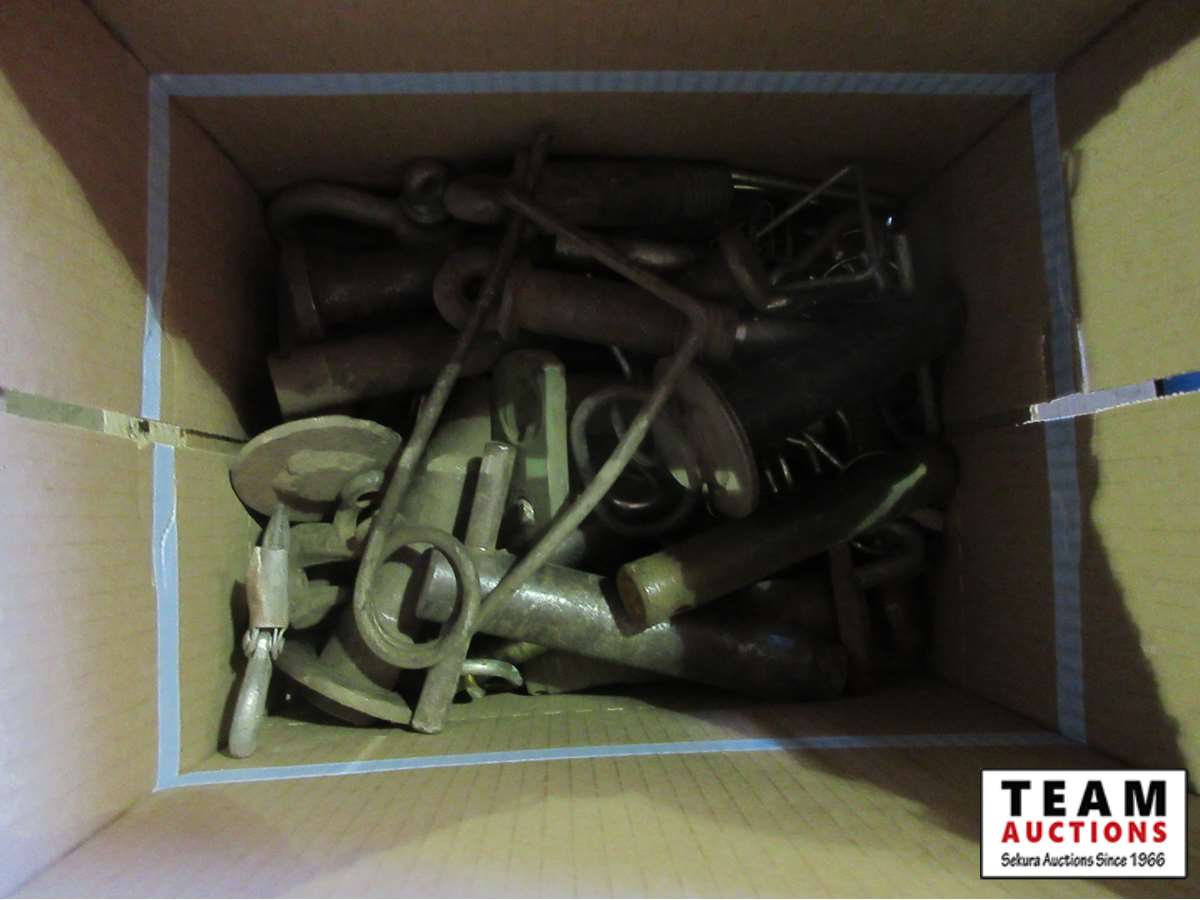 empty blue tool box, bucket of misc tools, box of pins & clips, samll tool box with tools