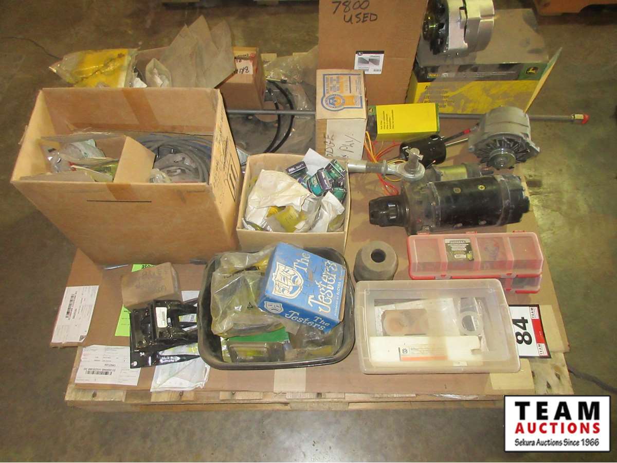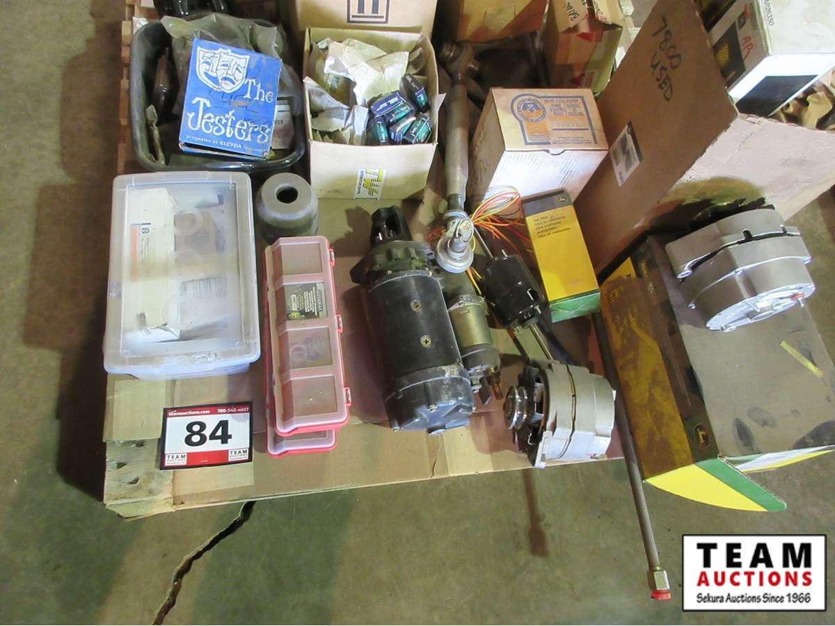 (1) JD alternator (new), (2) Delco alternators, tractor starter,cables, filters, mics Parts