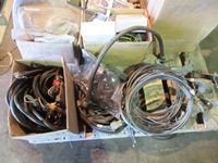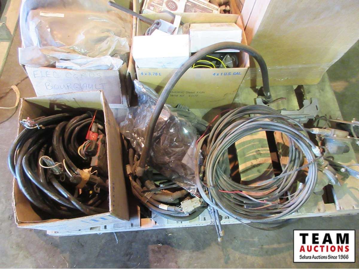 electrical components, cab cameras, wiring harness, (4) Bourgault air seeder Cords, box of mirrors, misc parts