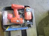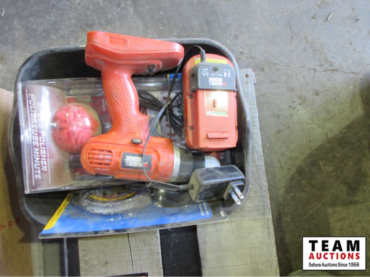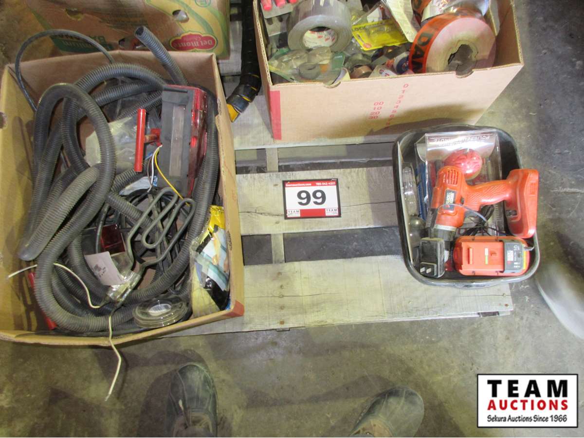 assorted of electrical components, assorted tape, B&D rechargeable drill, cab lites, magnetic tow lites, (2) Westward 10 piece hex key sets