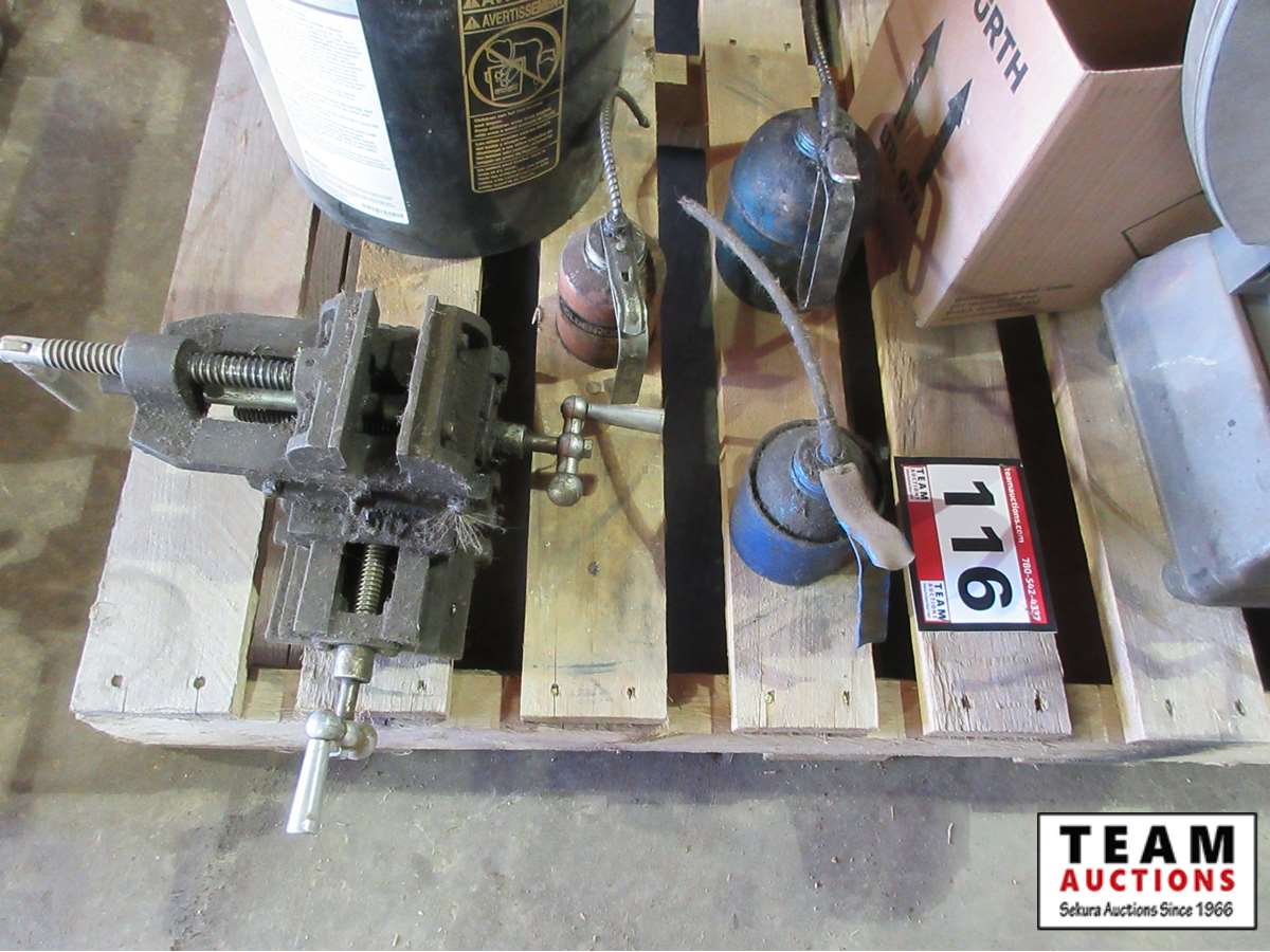 B&D 14" metal chop saw, (3) oiler cans, 4 way drill press vice, pail of Reddy rod