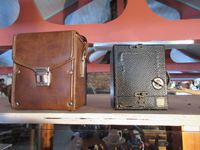 assorted cameras, coal miners oil lantern, razor blade sharpener, star fish, sea shells, miniature boats carved from cottonwood bark, metronome, check printer, moustache cup, assortment of glass jars, carvings, trophy cup