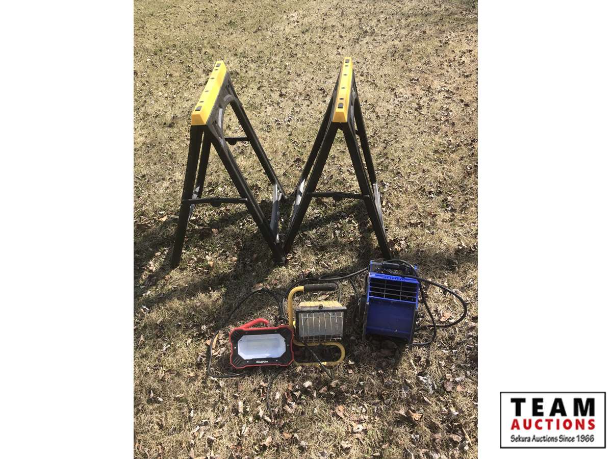 32 (2) Poly Saw Horses, (2) Lights, Fan