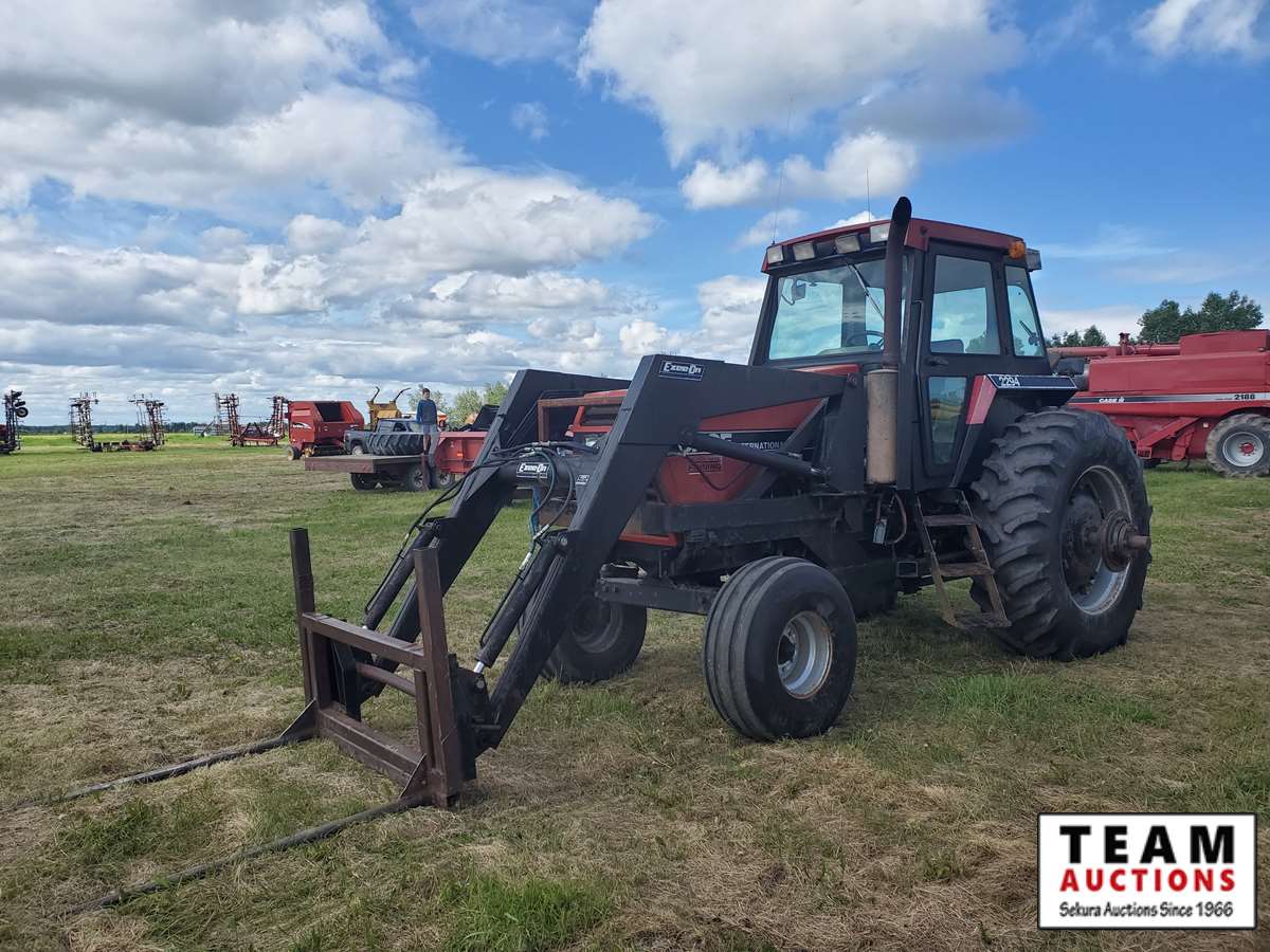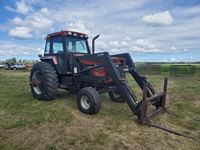 Ezee-On 2130 loader, quick attach bucket, quick attach shop built forks, duals, 12 speed powershift, cab, heat, air, 540/1000 pto, 2 hyd outlets, 50 % 14L-16.1 front rubber, 60 % 20.8-38 rear rubber/duals, new water pump, new starter, complete service filters & oils, 6445 hours