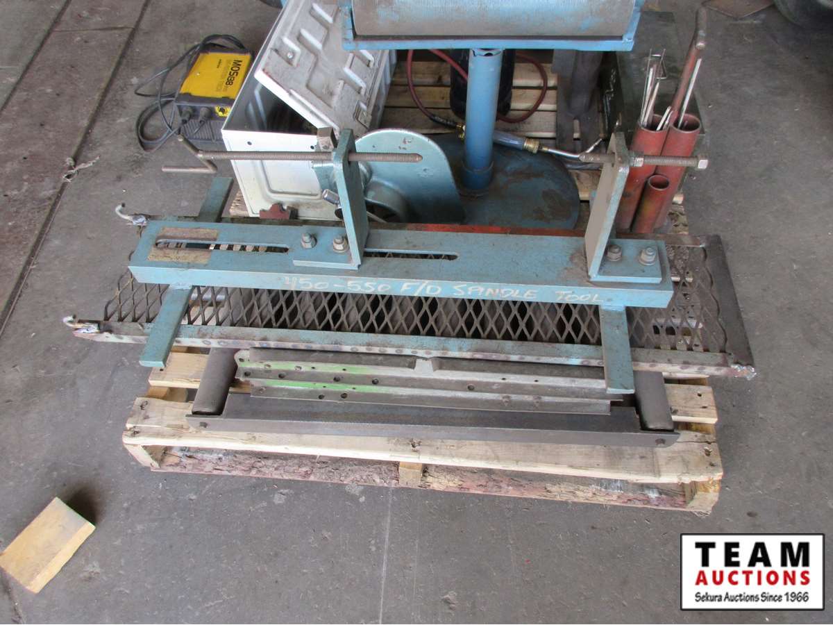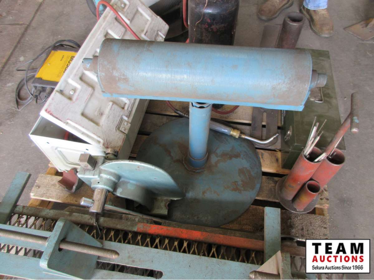 Moss 138 invertor, small torch with bottle, arbor press with broken mounts, welding rod holder, roller stand, torch parts