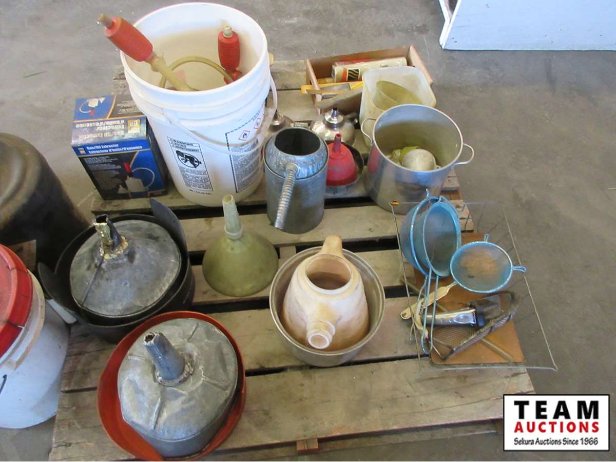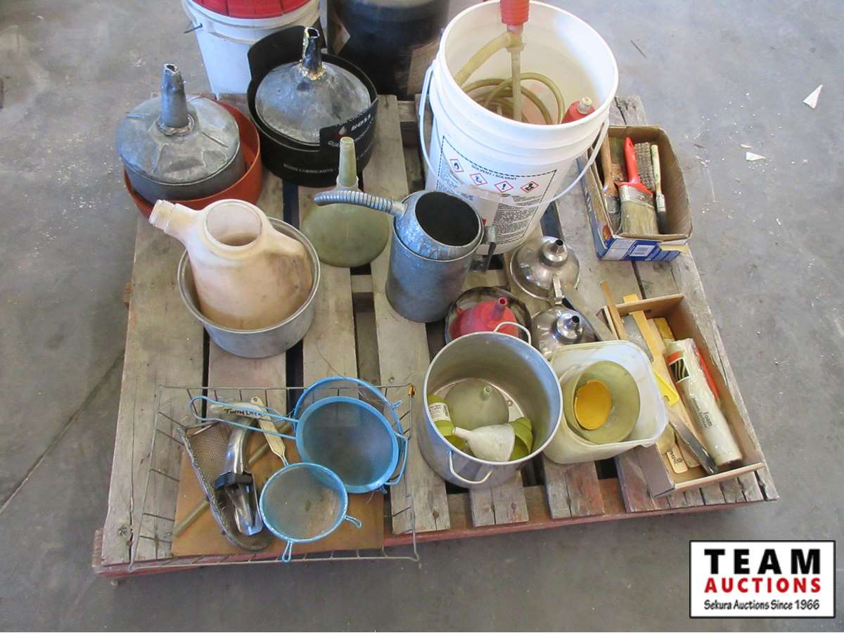 funnels, paint brushes, oil containers, hand pumps, etc