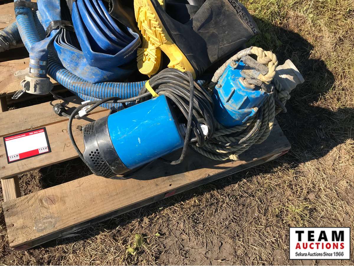 (1) 2" submersible pump, (1) 3" submersible pump, hip waders (size 10)