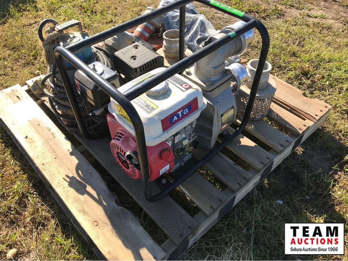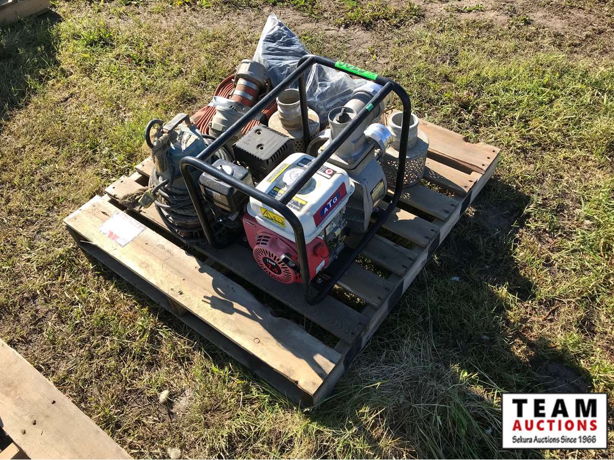 (1) 3" gas Trash Pump, (1) 3" submersible pump, (1) hip waders (size 11)