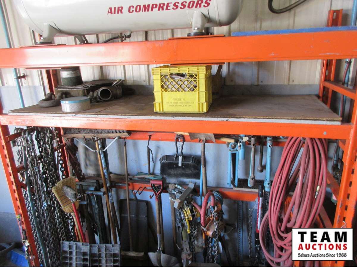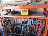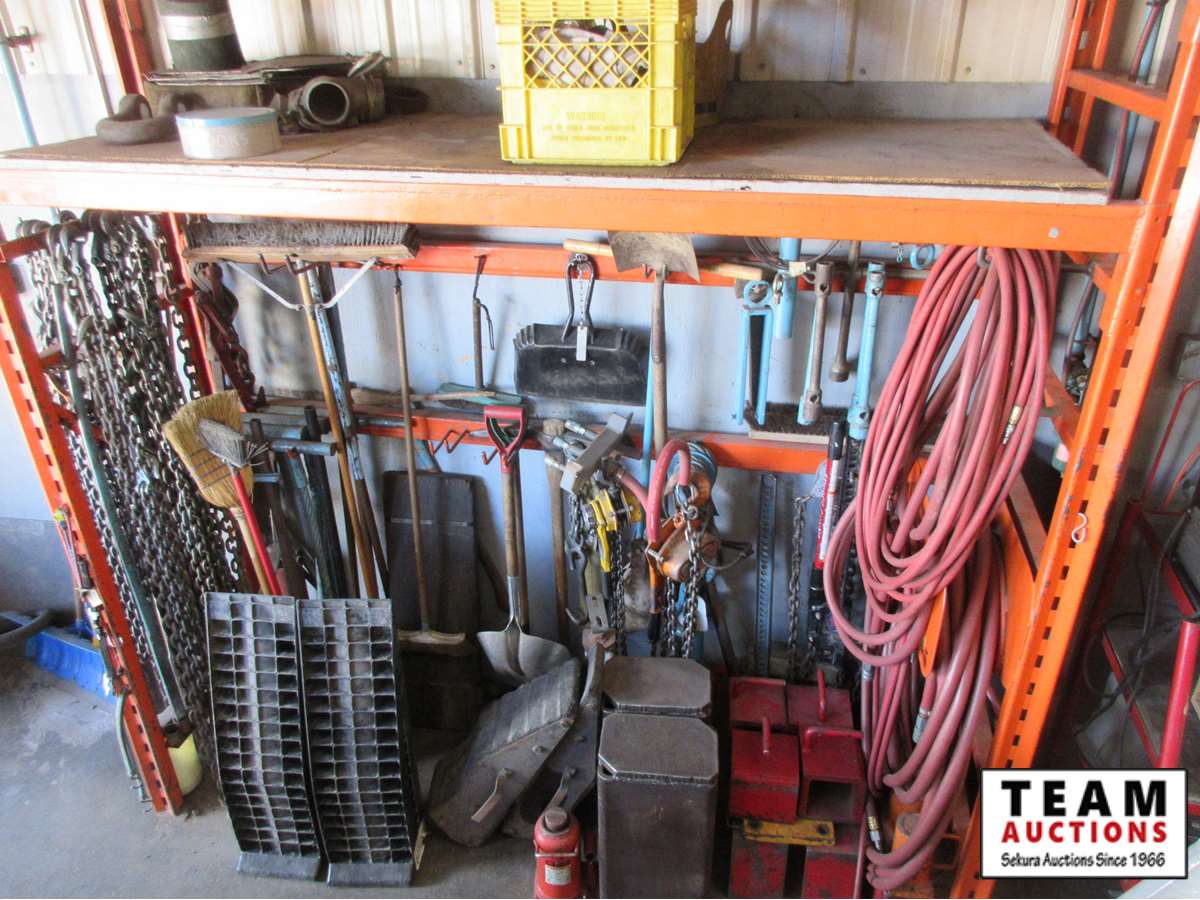 chains, boomers, hydraulic jack, jackall, air hoses, shop built metal stands, brooms, shovels, pins, large drifts with handles, clevises, wheel chalks, chain come-a-longs, and more