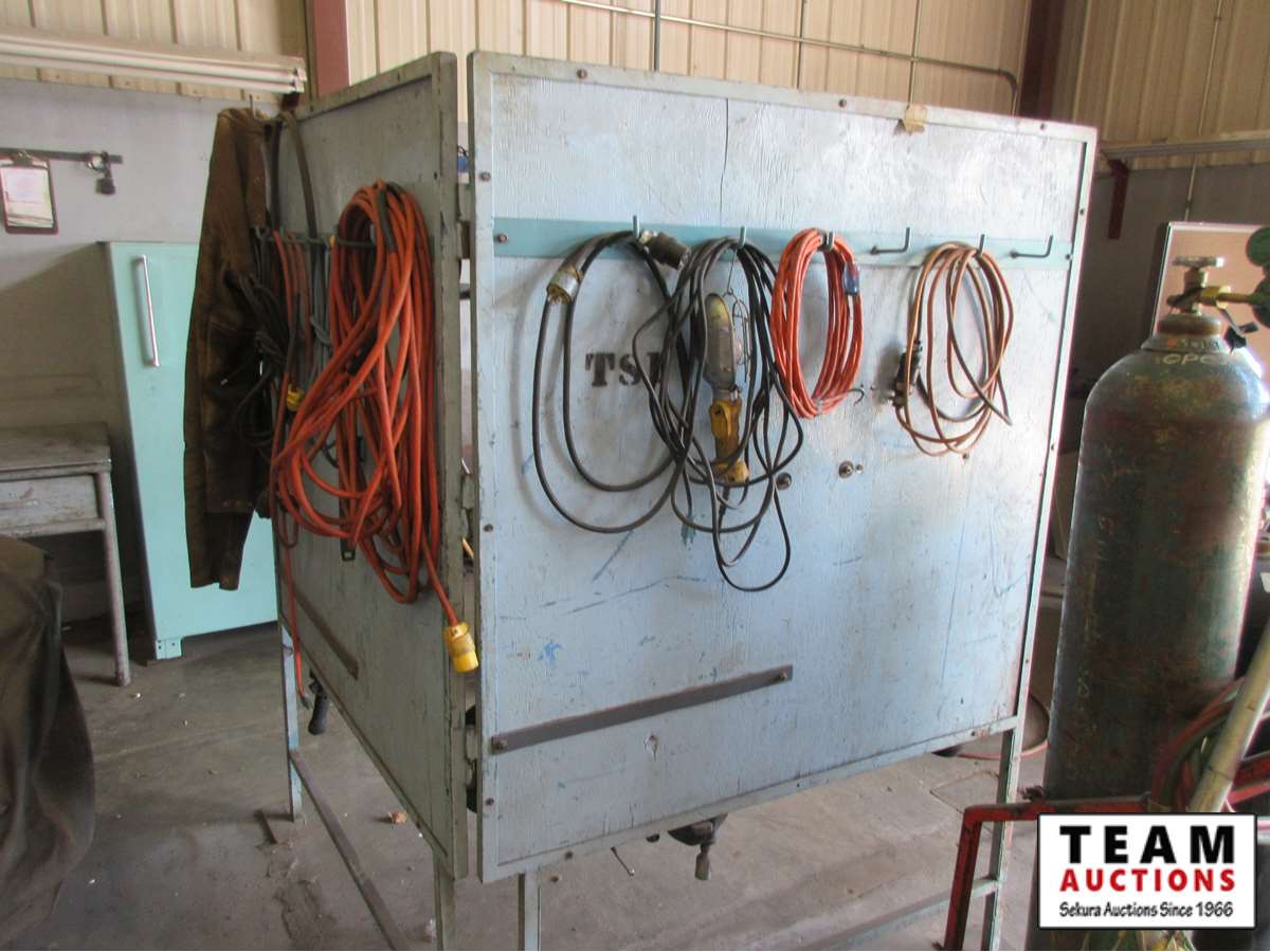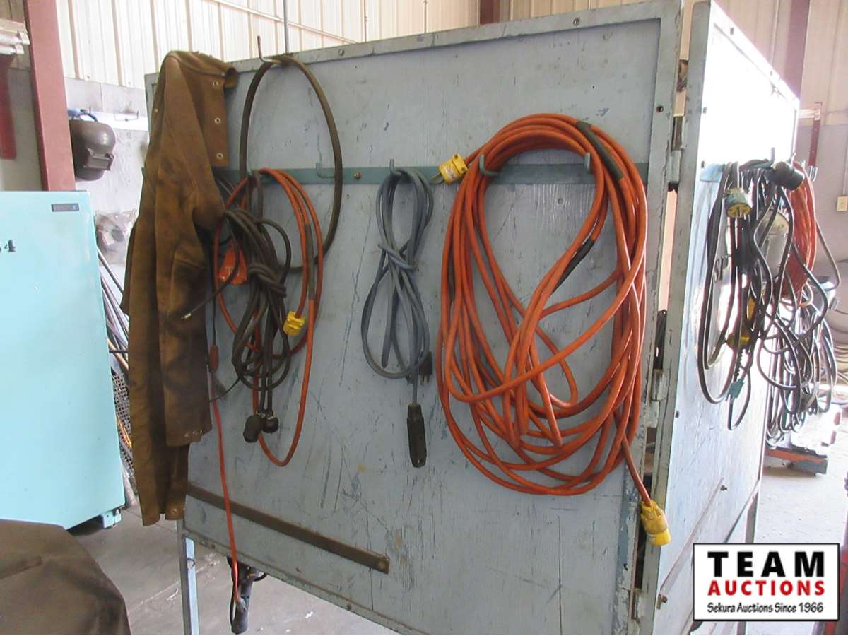 welding shield with hangers for cords & grinders, grinders, cords, wire wheels, C clamps, welding tools