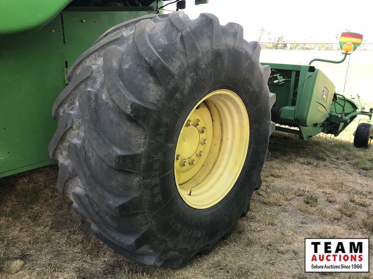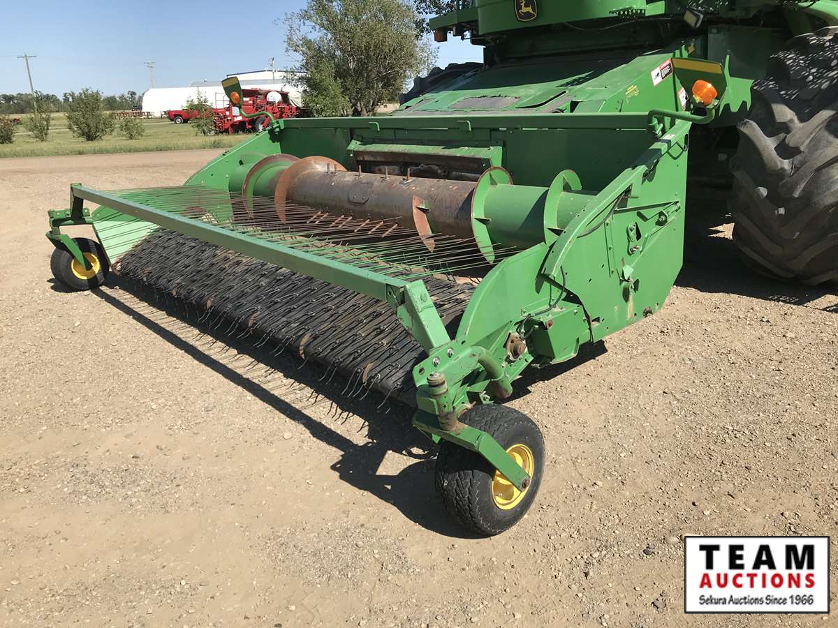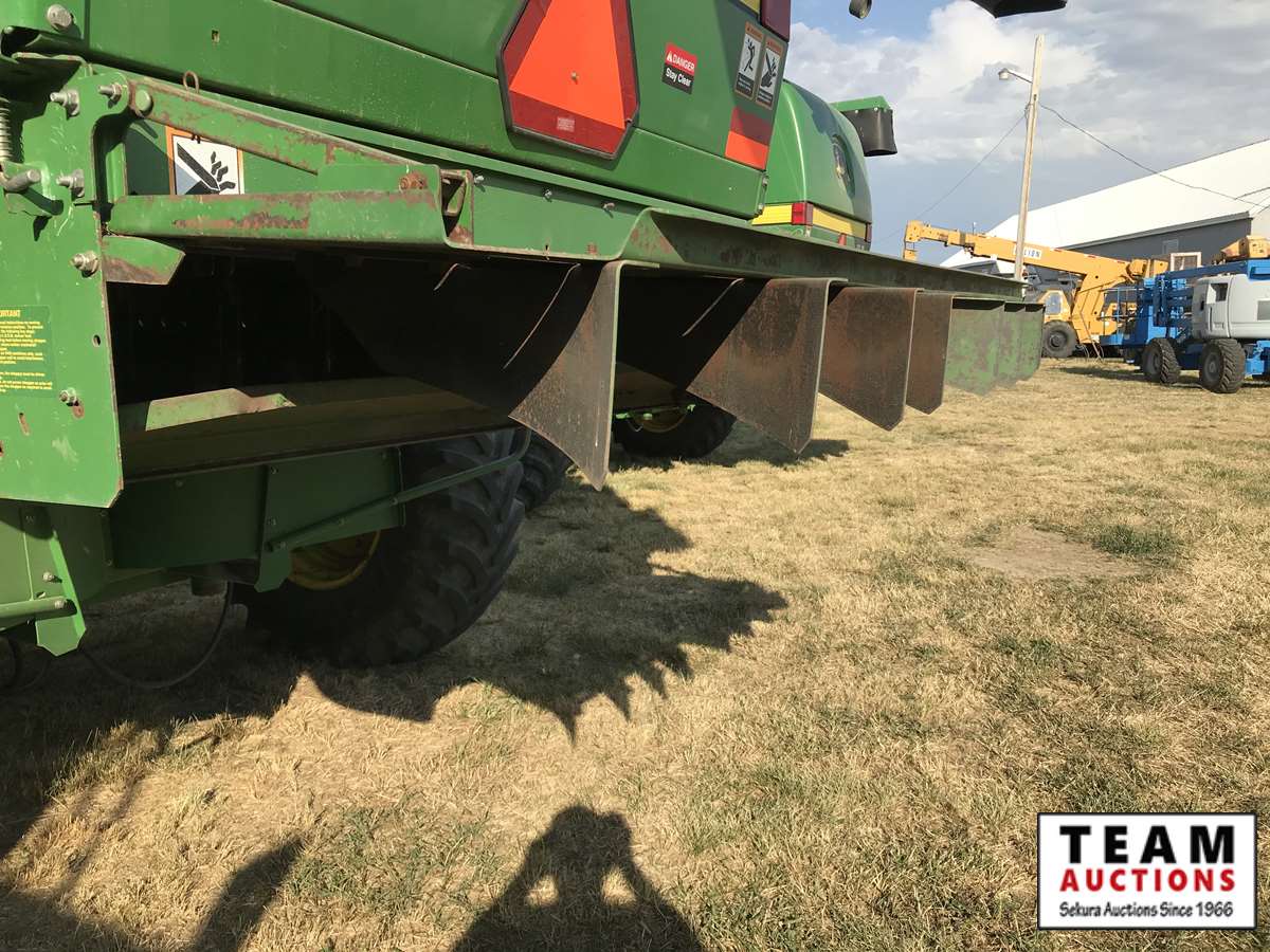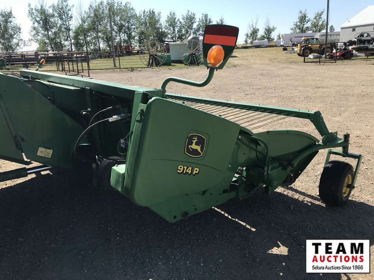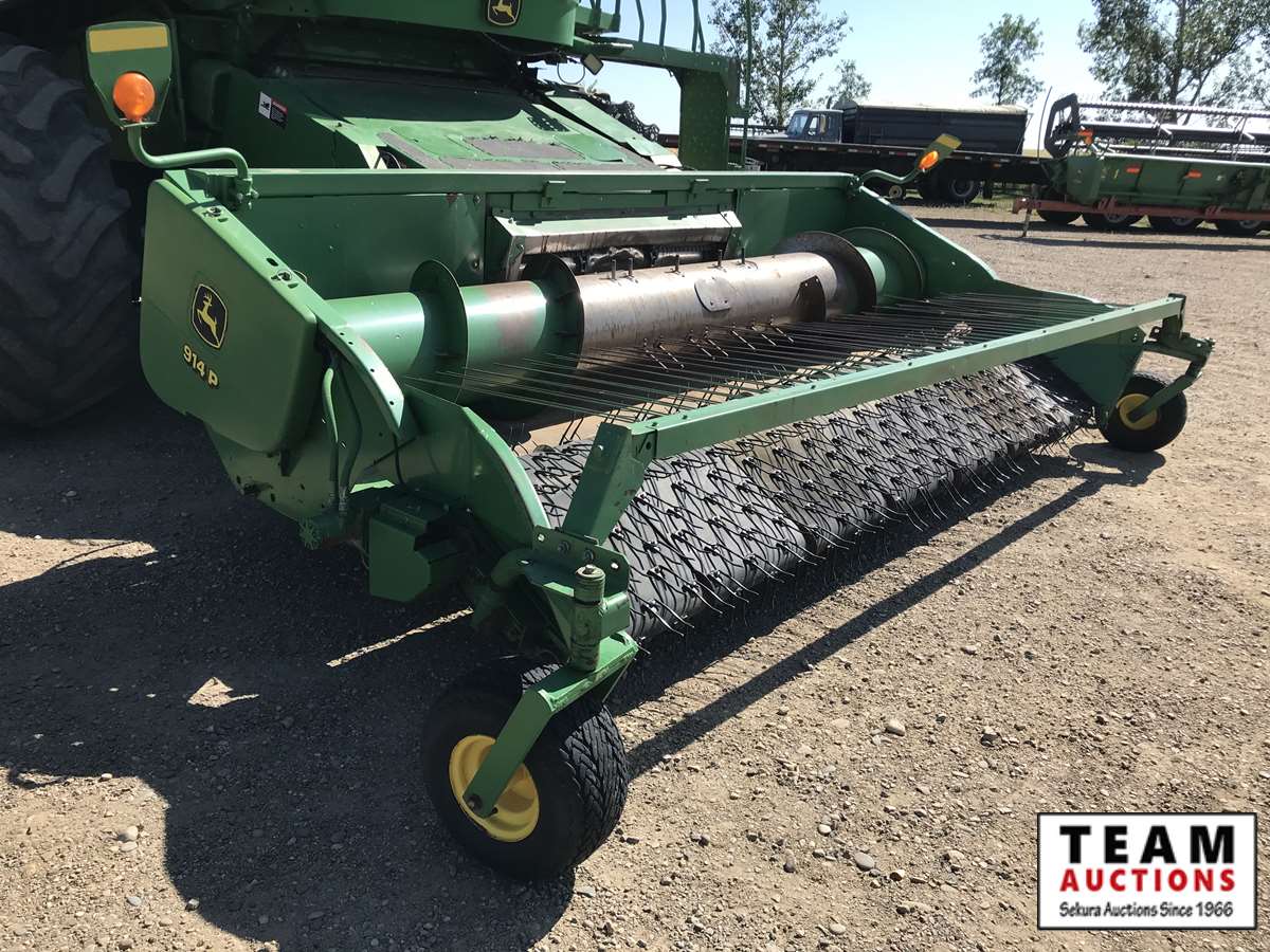 2003 914P pickup header s/n H00914W700365, reverser, VSR, auto HHC, F&A, 19 ft auger, chaff spreader, fine cut chopper, 800/65R32 F, 16.9R26 R, 5140 sep hrs showing, 6847 hrs