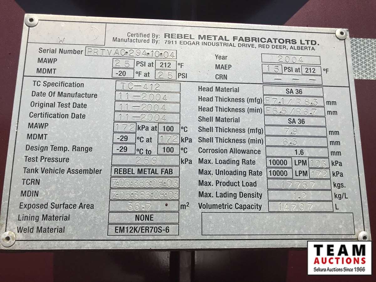 Caterpillar C15, 475 HP, engine brake, Eaton Fuller 18 speed, 28 in. sleeper, Newway A/R suspension 2004 Rebel tank, DOT TC412, full open rear gate, hoist, vibrator, blower, 288 in. WB, aluminum wheels, 425/65R22.5, 11R24.5, vacuum 4,975 hrs, 21,030 hrs, 373,184 kms, CVIP expired 05/2019